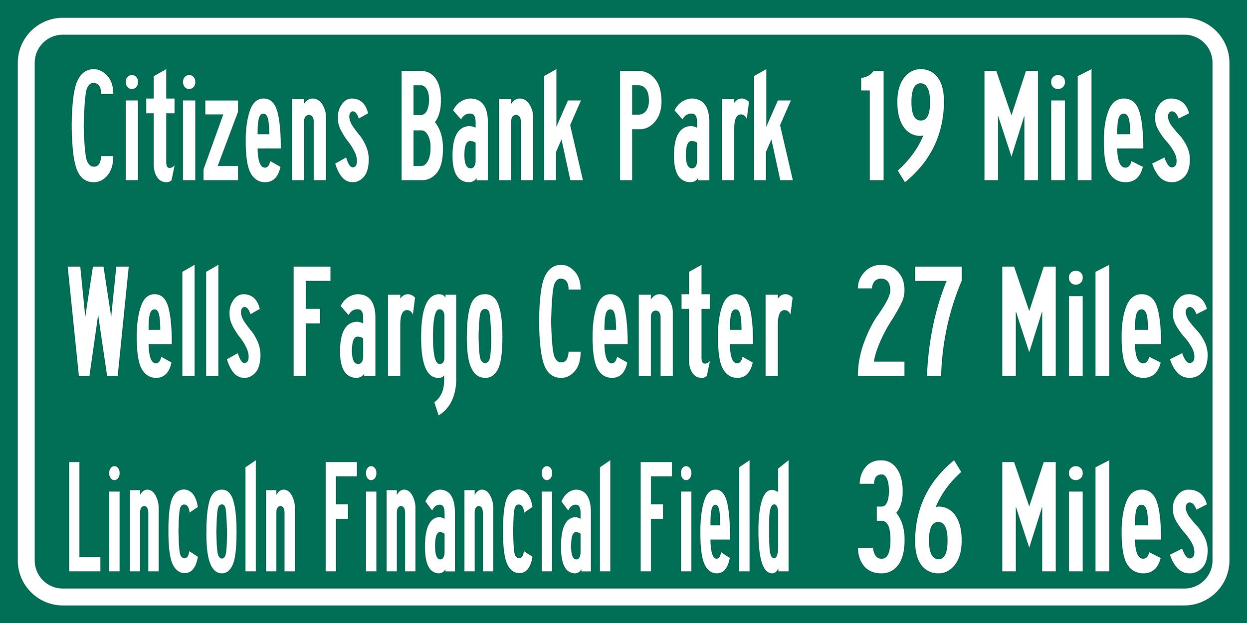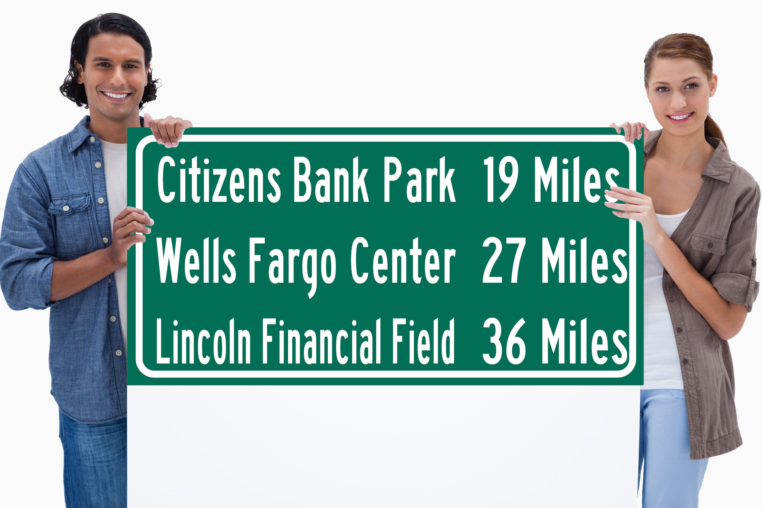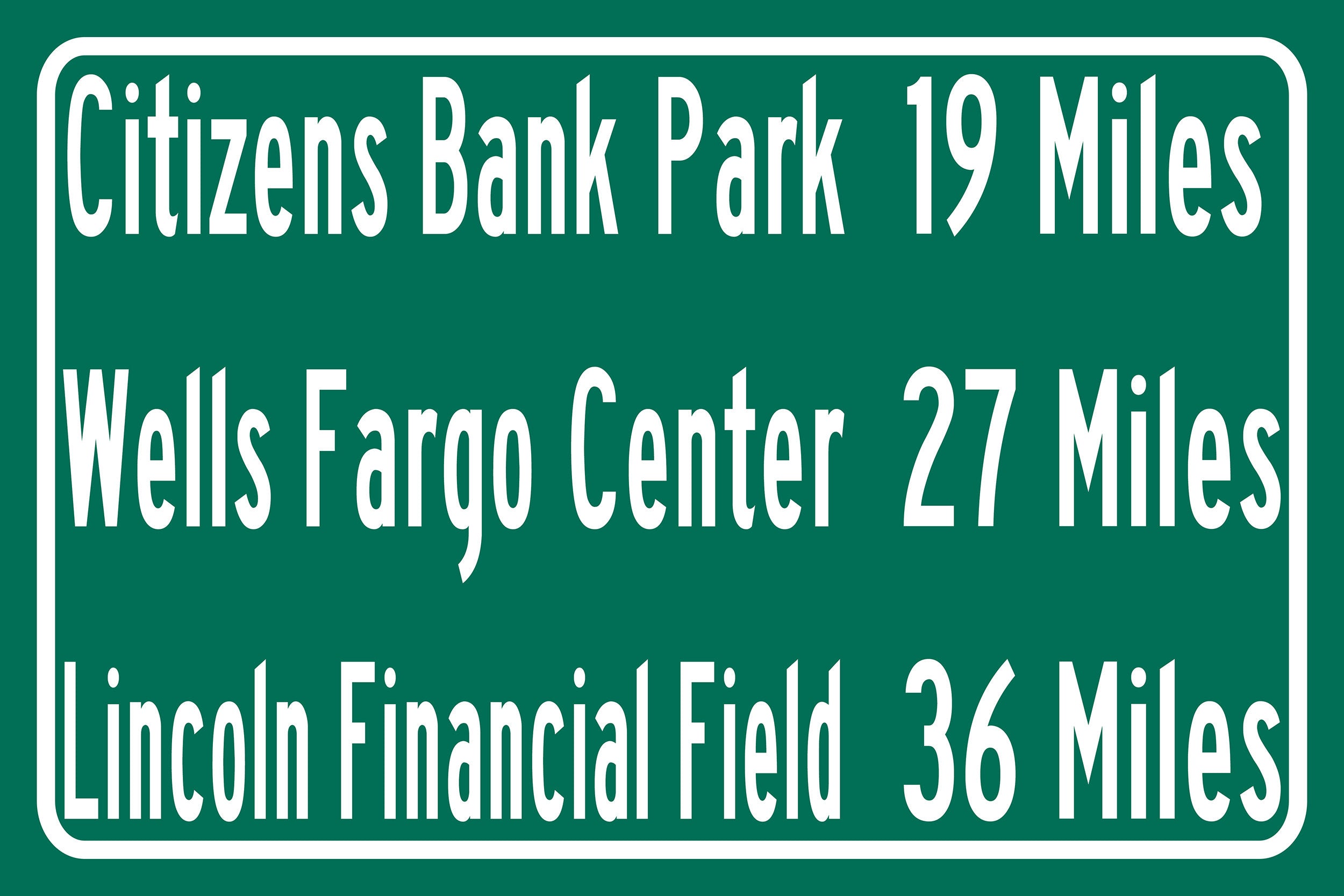 Personalized Highway Distance sign to Citizens Bank Park in Philadelphia. Custom replica road sign, with a watercolor photo of the stadium made with real distance from you to Citizens Bank Park. WE GO HUGE!! Not some itty-bitty sign, Our signs are as large as 2 x 3 FEET! Citizens Bank Park highway sign. Philadelphia Phillies sign