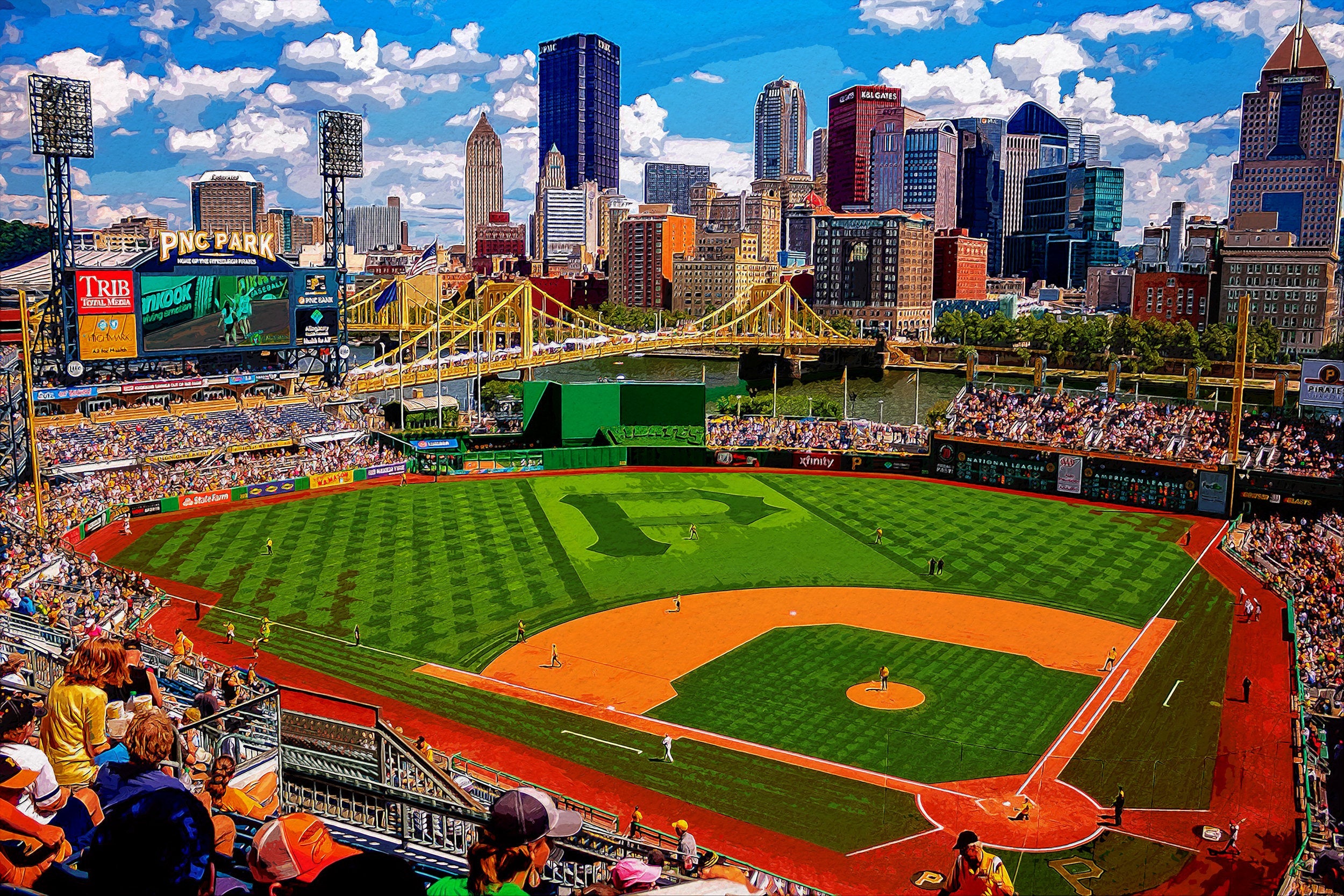 PNC Park in Pittsburgh watercolor. Great colors and plenty of lights. Available as a SINGLE canvas at 12″x18″, 16″ x 24″ , 24″ x 36″ , or 32″ x 48″. Pittsburgh watercolor