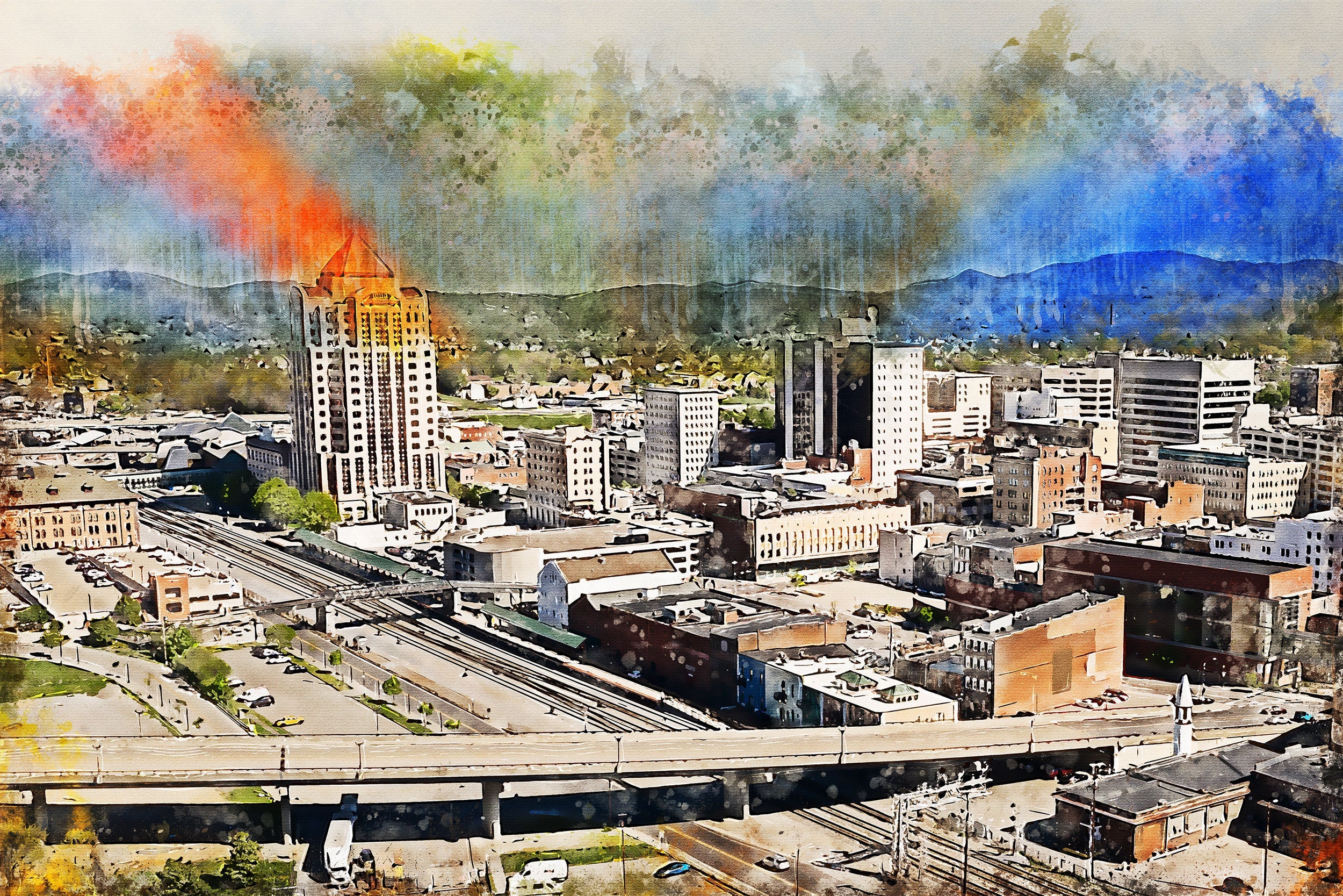 The beautiful city of Roanoke Virginia watercolor canvas and ready to hang. Stunning colors that make for the perfect wall decor. Roanoke Virginia watercolor on canvas