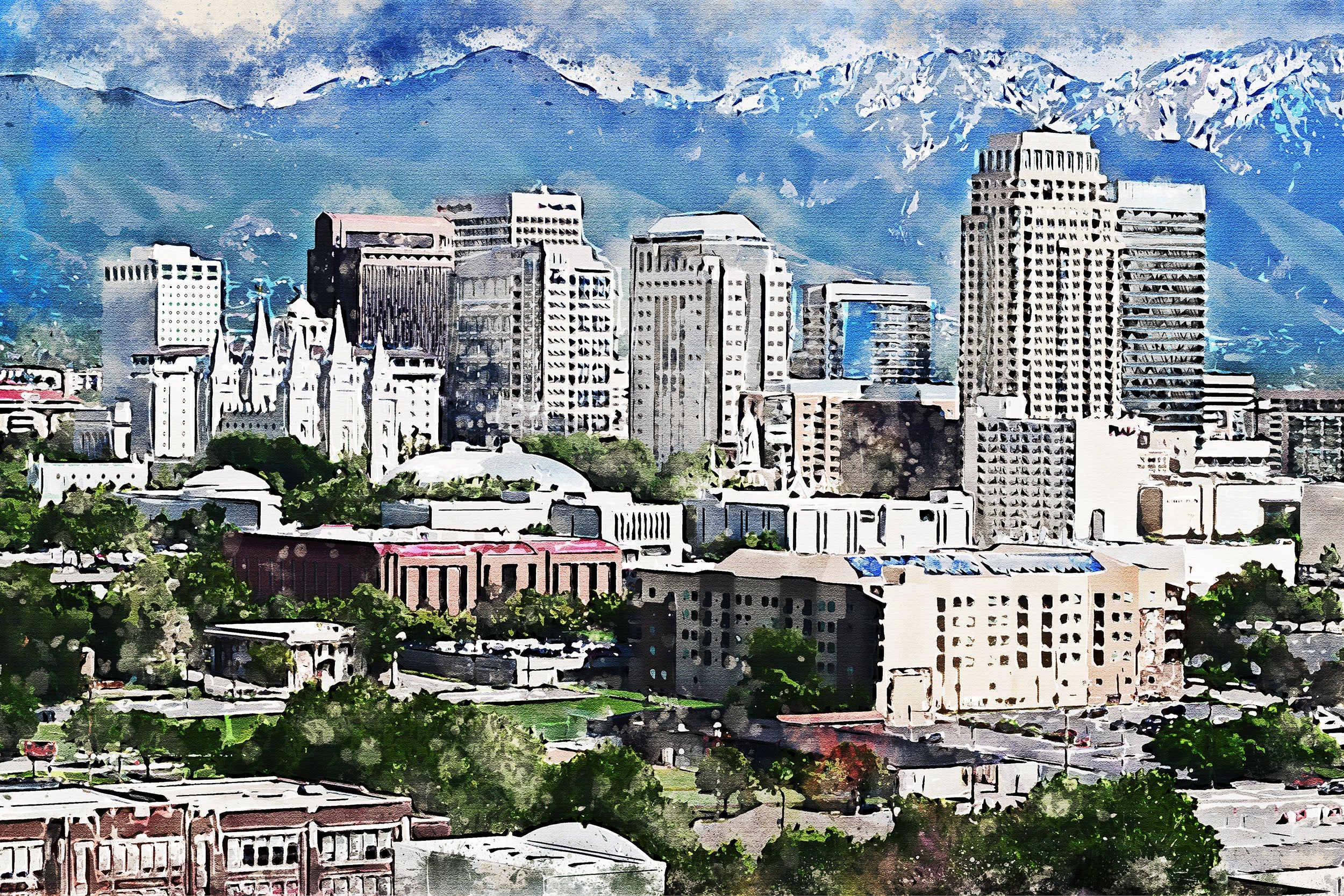 The beautiful city of Salt Lake City as a watercolor on canvas and ready to hang. Stunning colors that make for the perfect wall decor. Salt Lake City Utah watercolor canvas