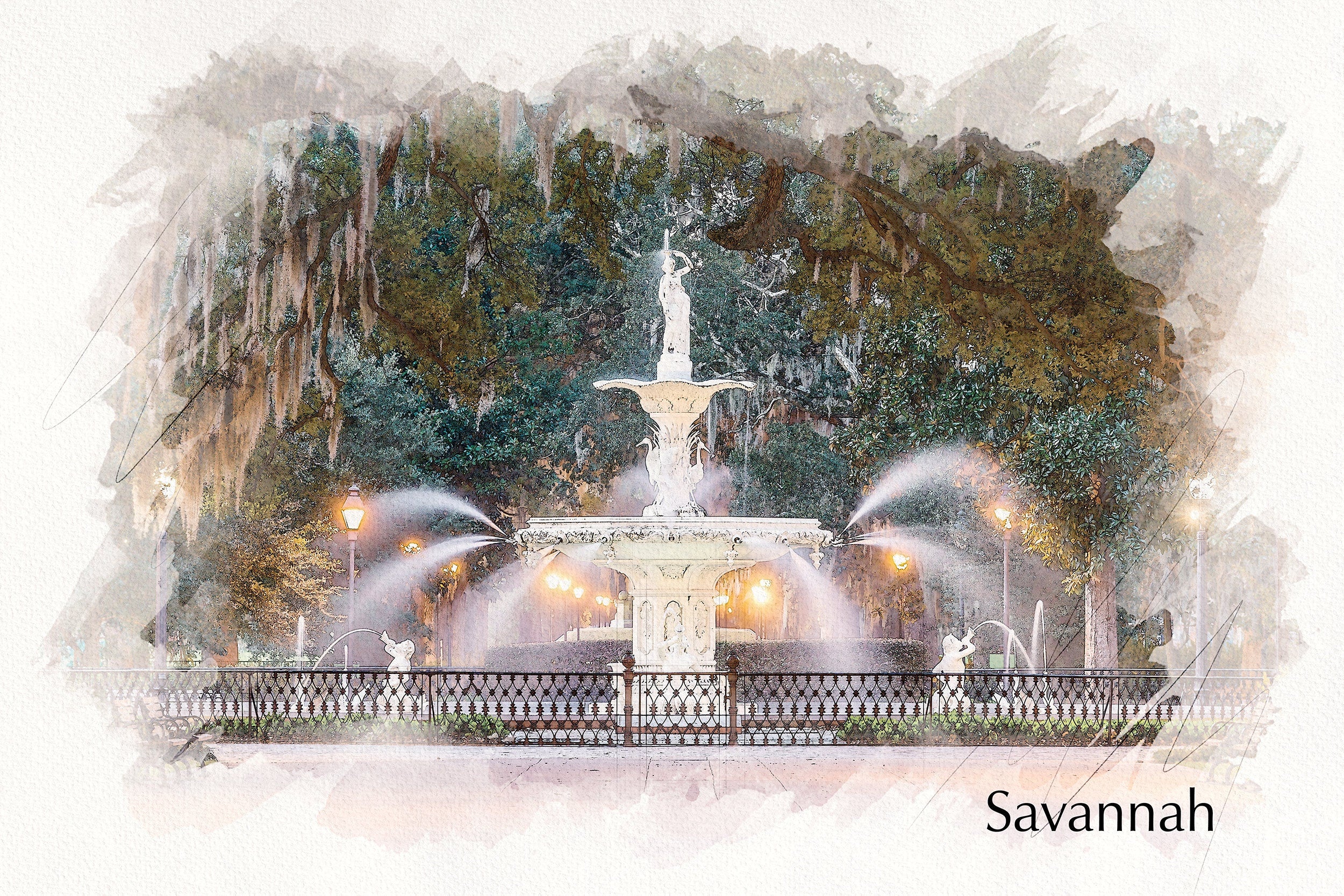 Be the first to review “Savannah Georgia watercolor skyline canvas, Savannah Canvas, Savannah wall canvas, Forsyth Park, Savannah watercolor waterfront”