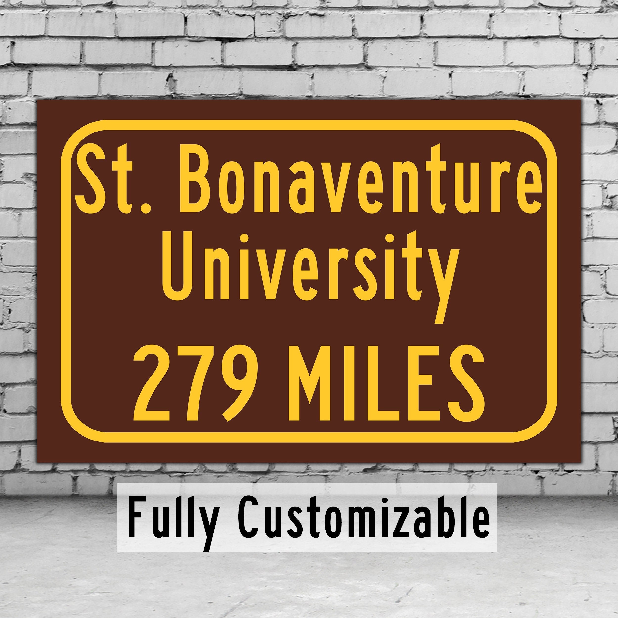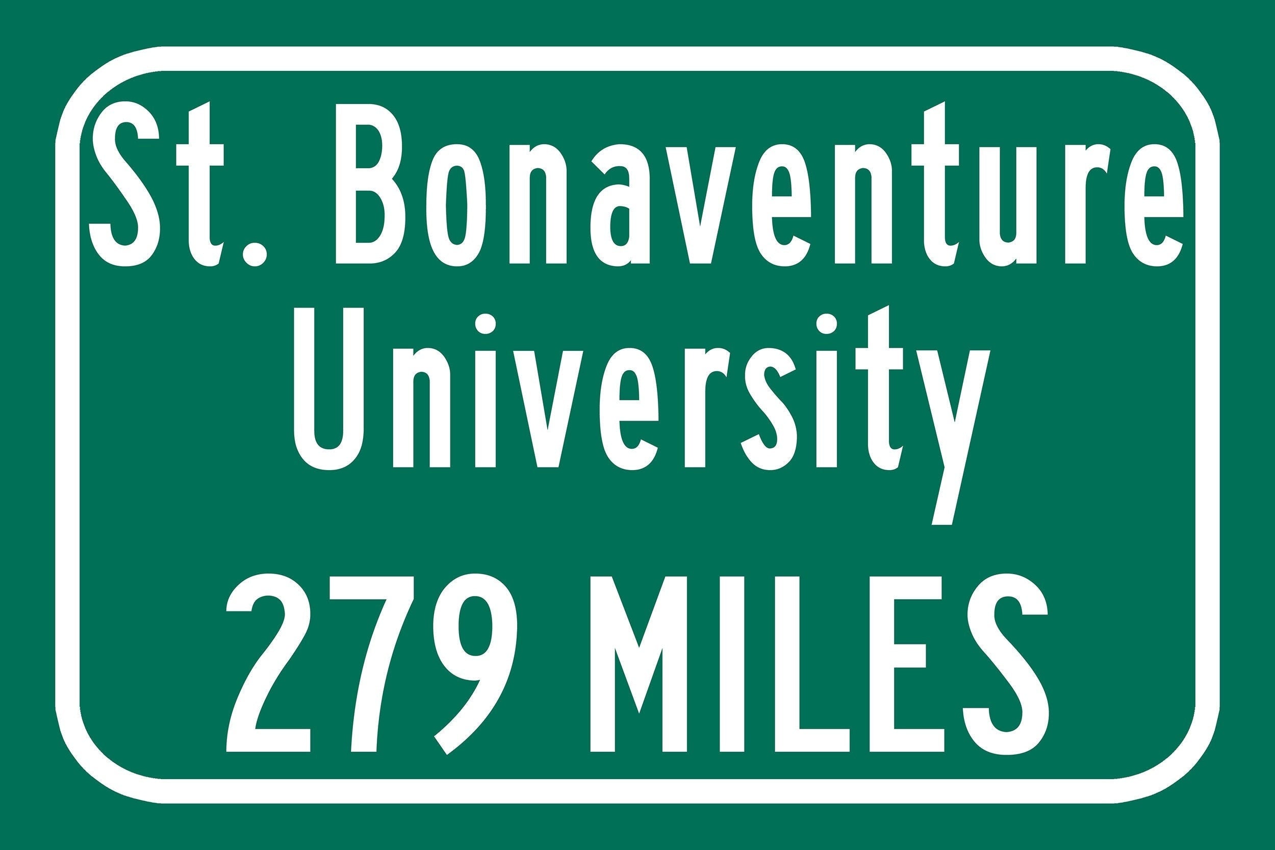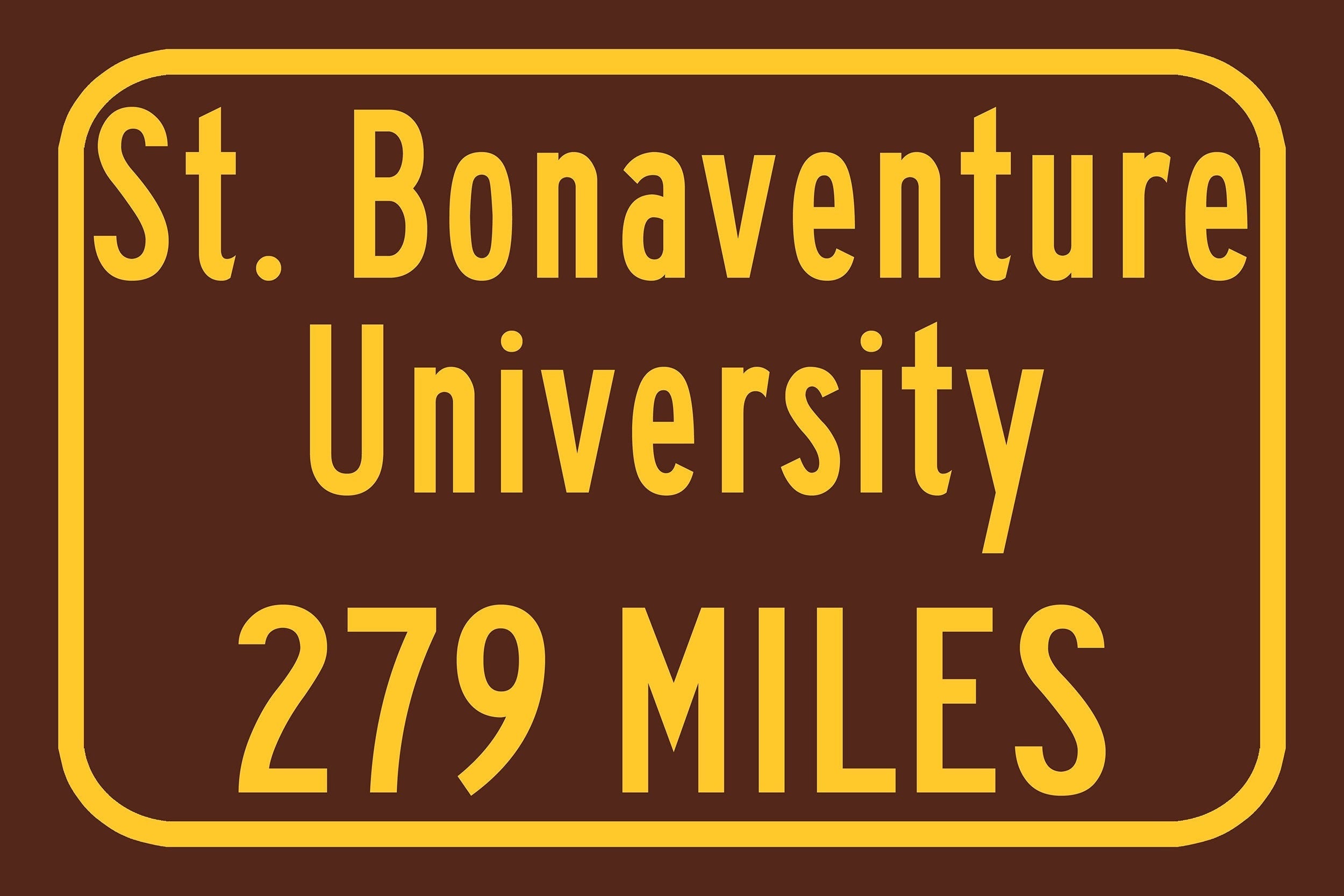 Personalized Highway Distance sign to St. Bonaventure University / St. Bonaventure University sign. St. Bonaventure University sign.
