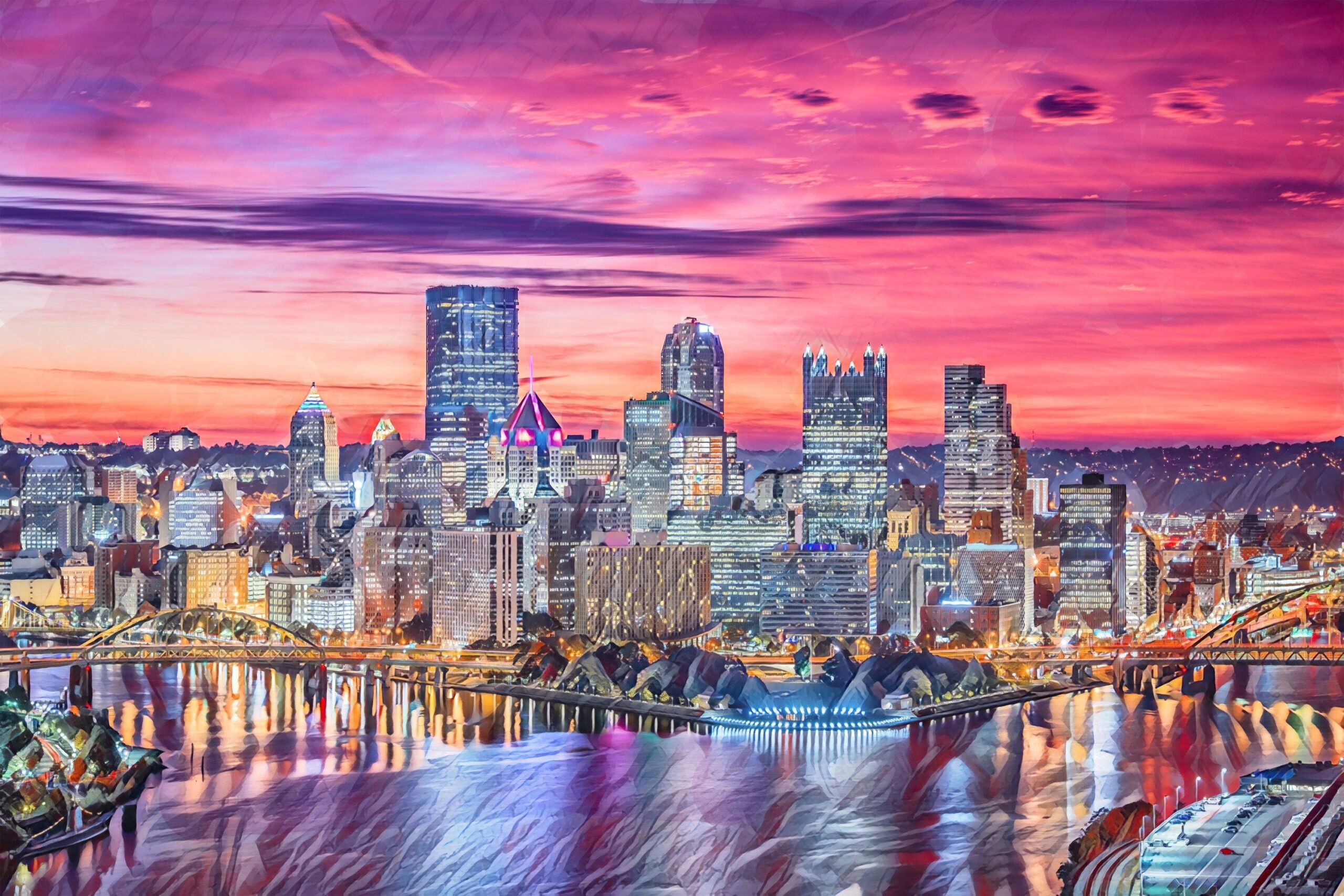 The beautiful watercolor of Pittsburgh on canvas framed and ready to hang. Stunning colors that make for the perfect wall decor. Pittsburgh colorful watercolor