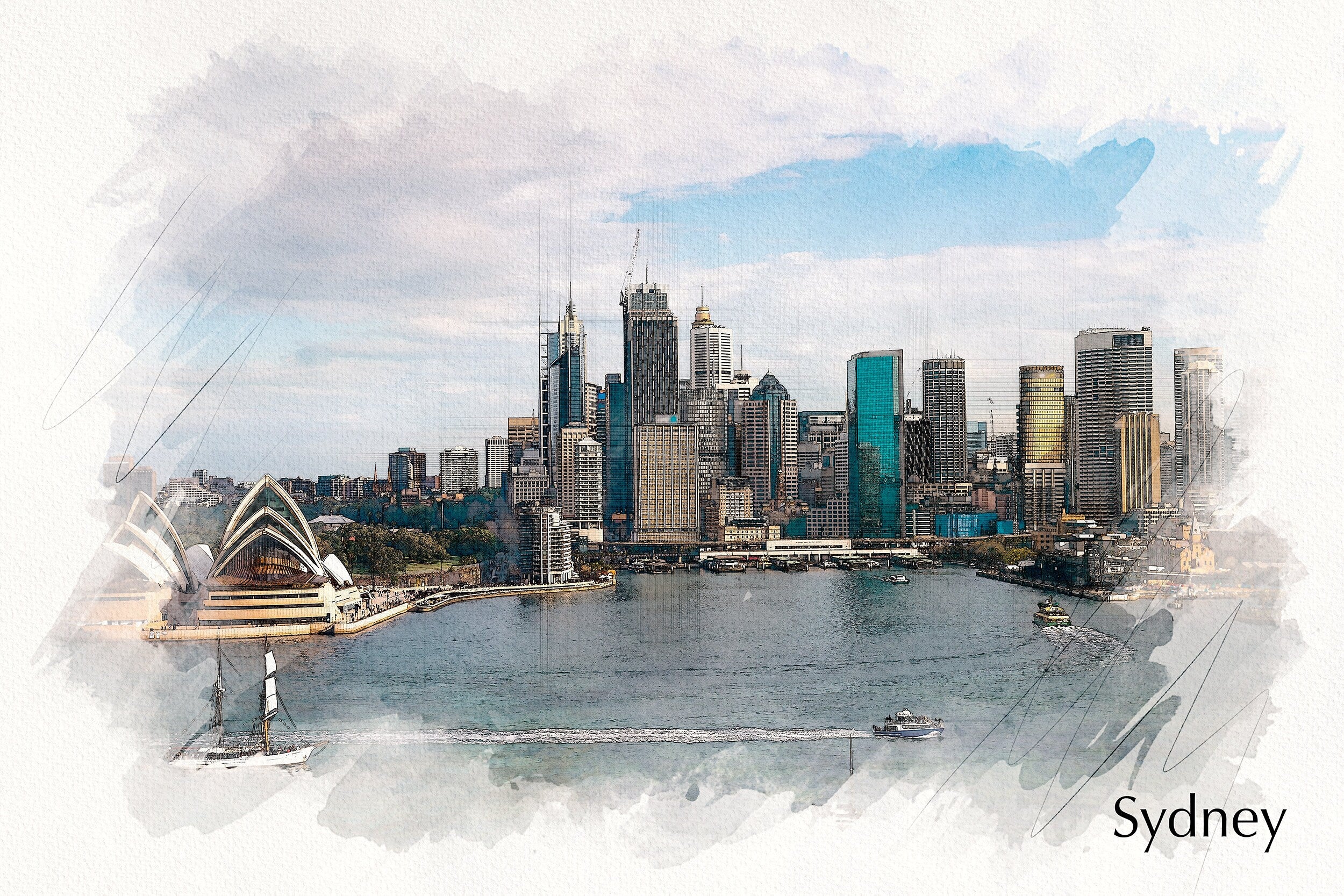 Great watercolor print of Sydney Harbor in Australia on canvas. Great colors and plenty of lights. Great for a piece of wall art. Available as a single canvas at 16″ x 24″ , 24″ x 36″ , or 32″ x 48″ or we can make you a special 3 panel work of art. Sydney watercolor