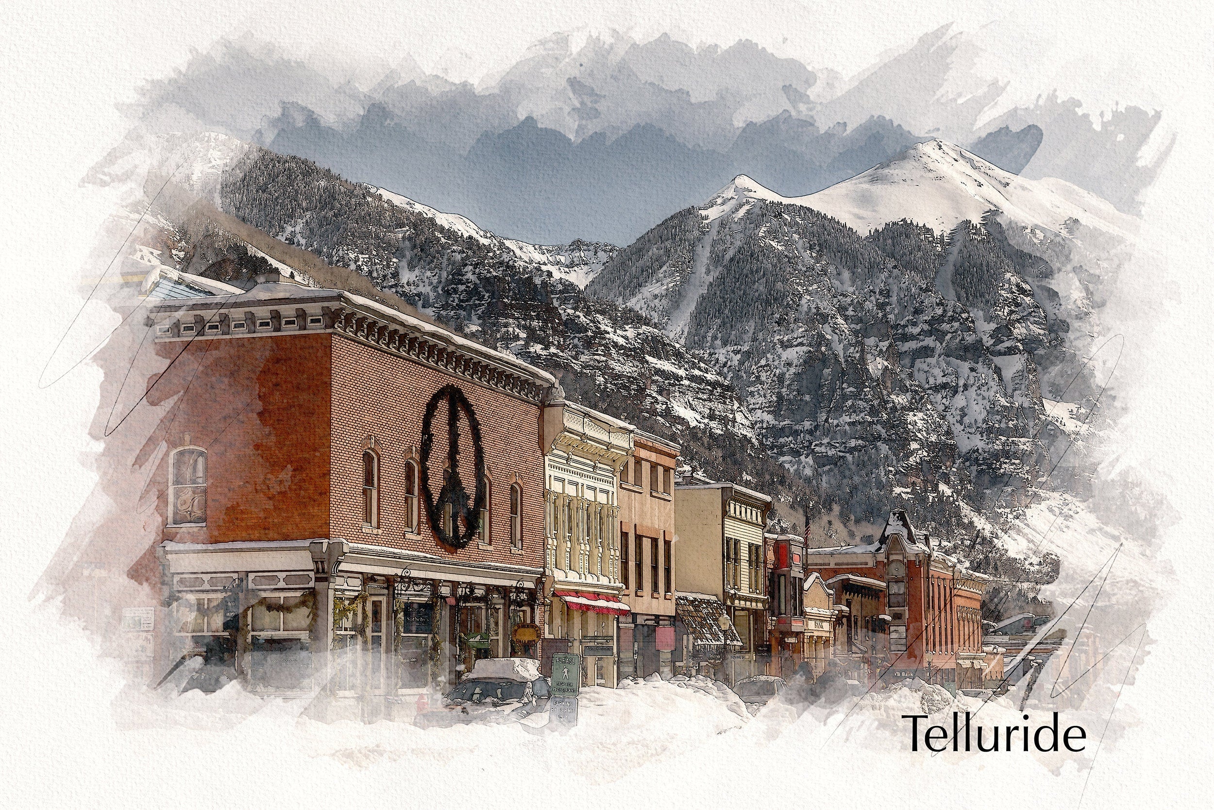 Stunning watercolor sketch of the Telluride Colorado skyline. Great for a piece of wall art. Available as a single canvas at 16″ x 24″ , 24″ x 36″ , or 32″ x 48″ or we can make you a special 3 panel work of art. Telluride Colorado watercolor