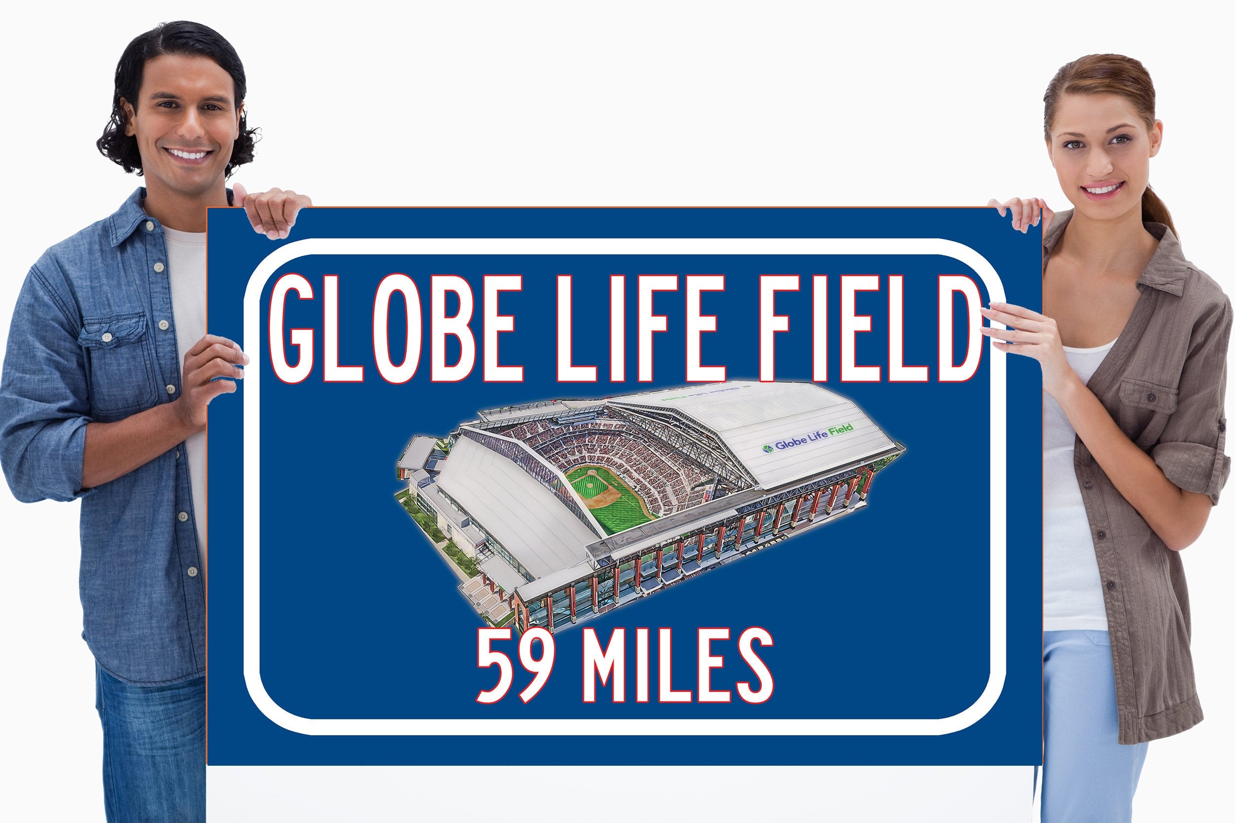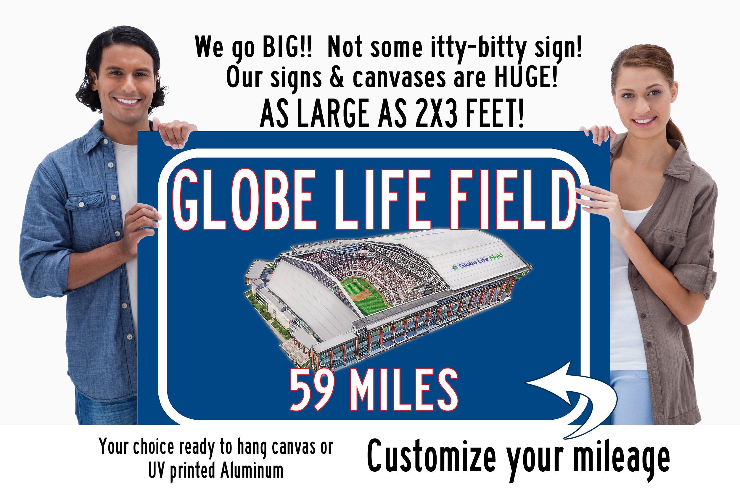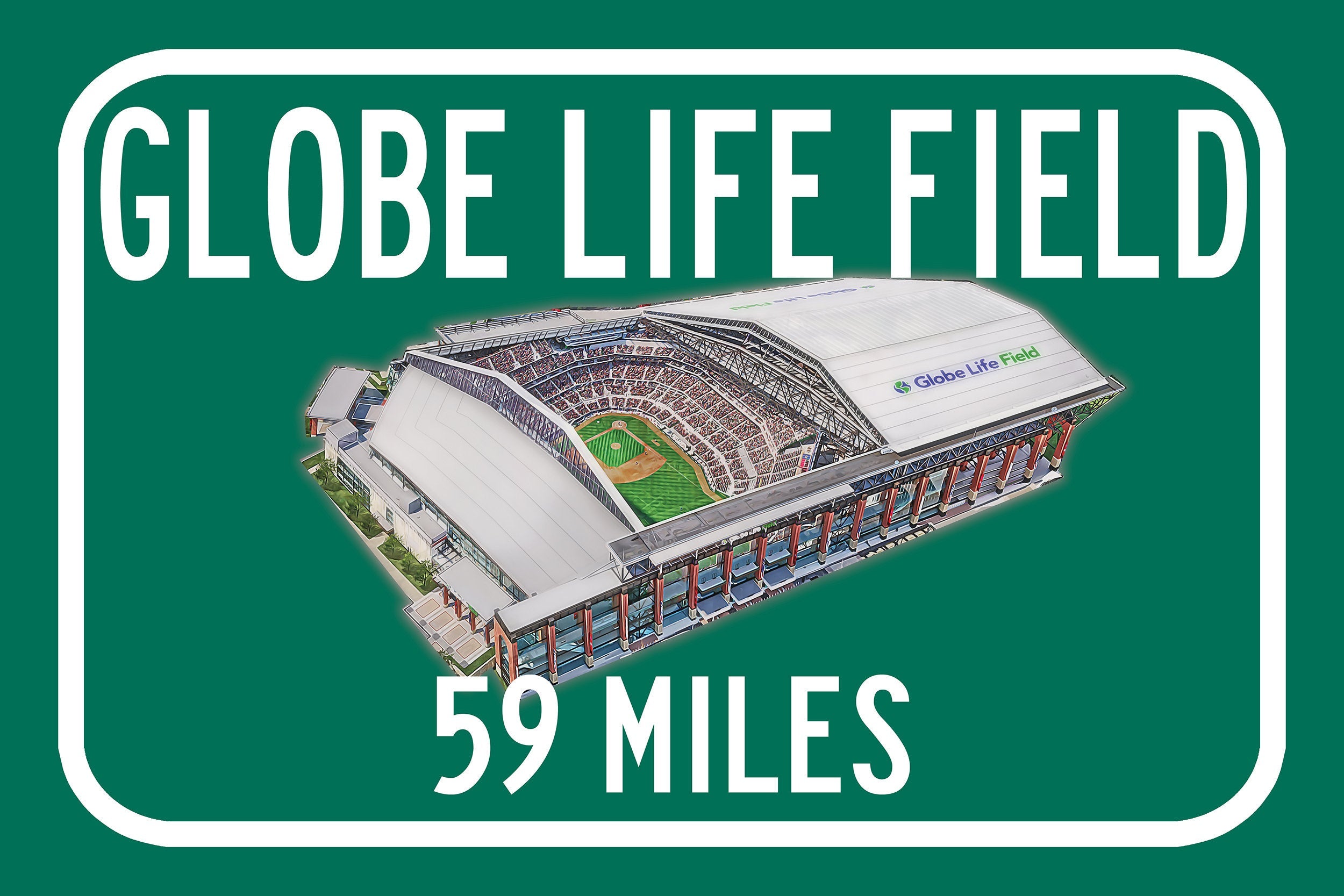 Personalized Highway Distance sign to Globe Life Field in Texas. WE GO HUGE!! Not some itty-bitty sign, Our signs are as large as 2 x 3 FEET! Globe Life Field highway sign. Texas Ranges Sign