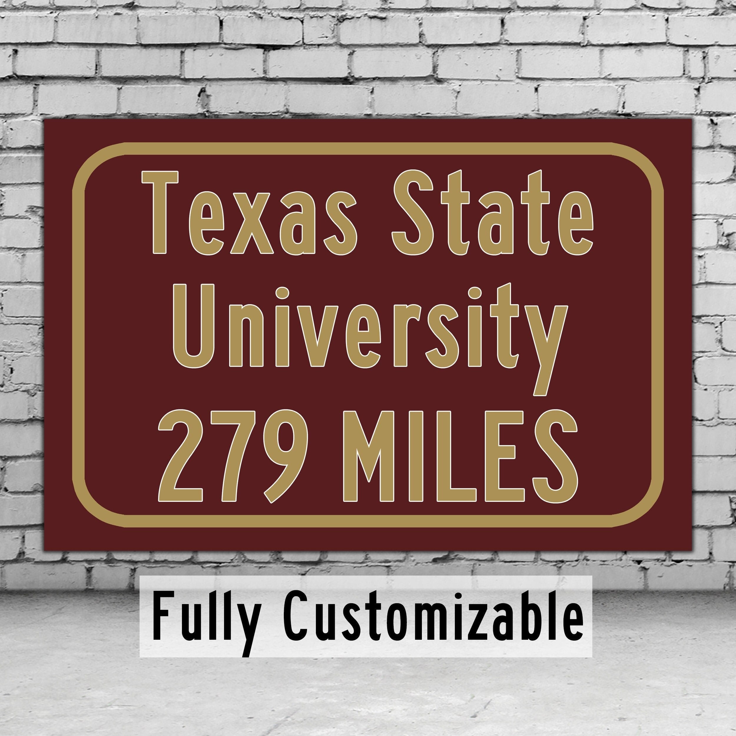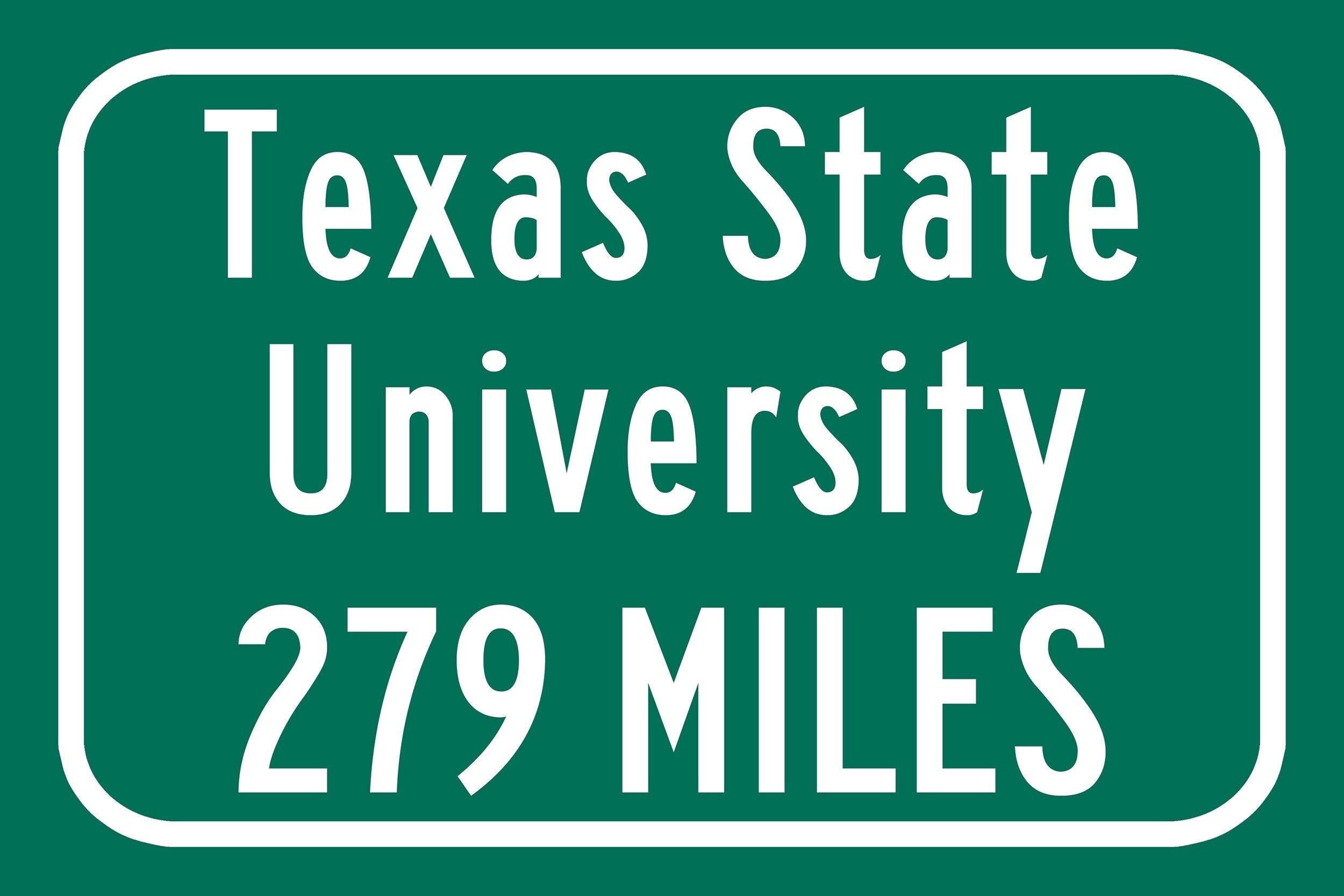 Personalized Highway Distance sign to Texas State University / Texas State Bobcats / San Marcos Texas