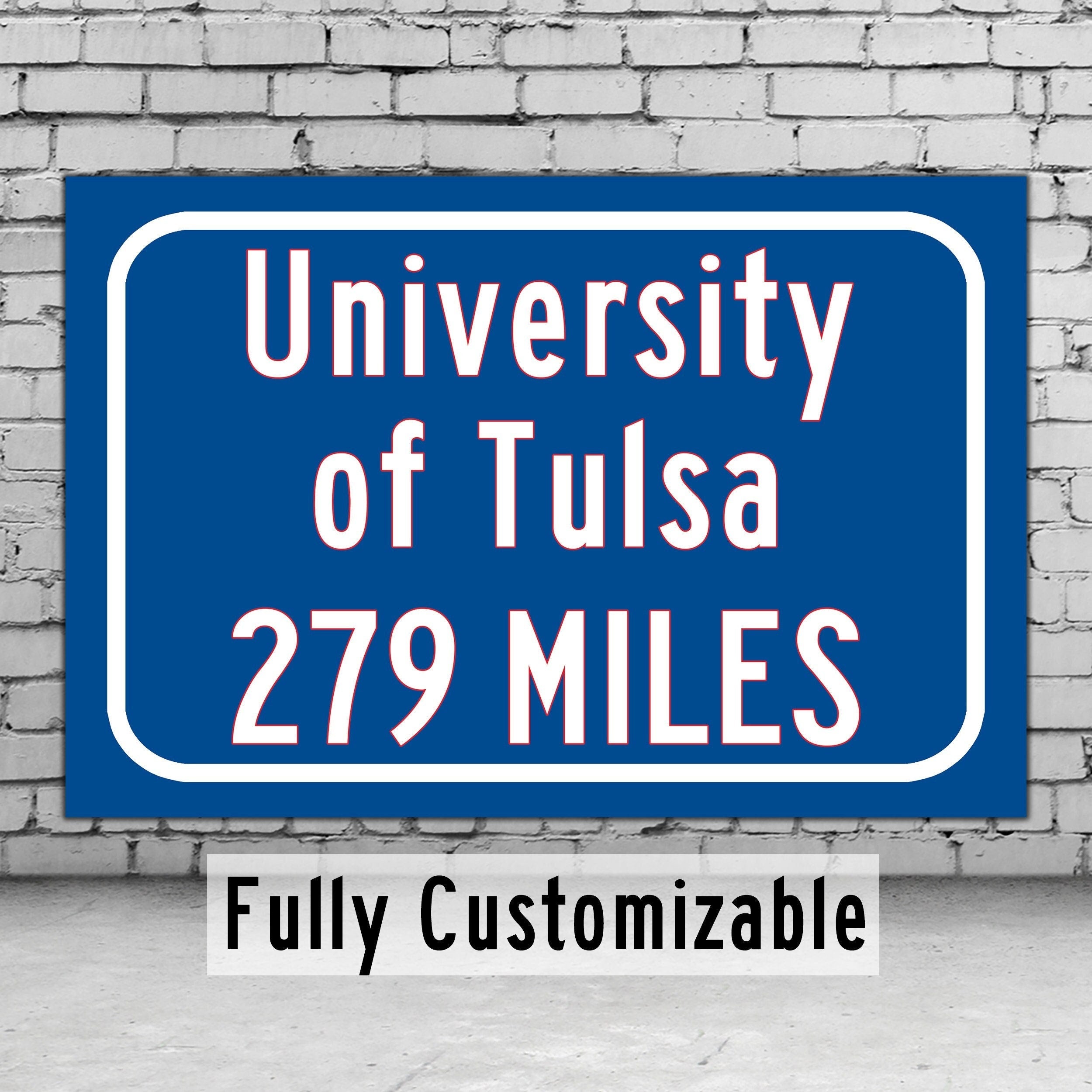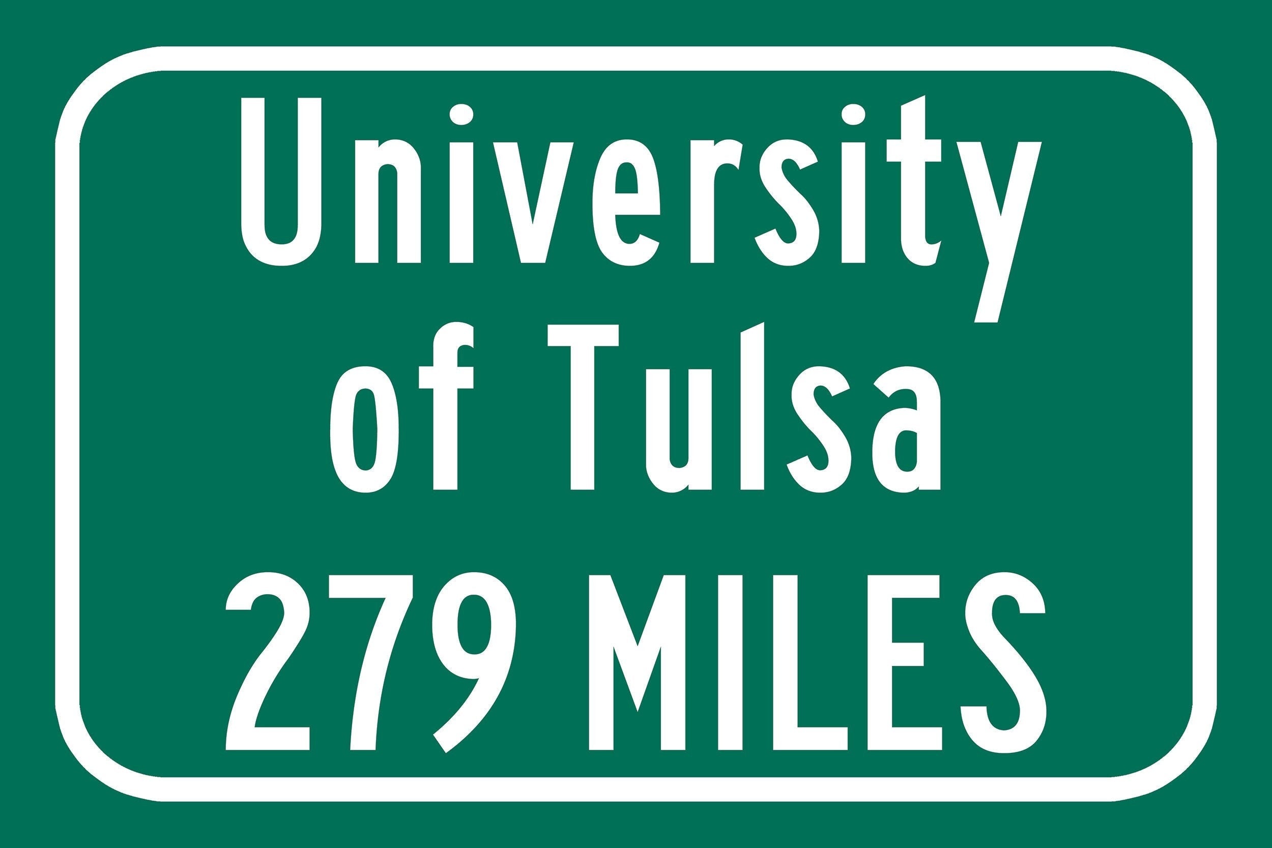 Personalized Highway Distance sign to The University of Tulsa / University of Tulsa sign. Tulsa Golden Hurricanes sign.