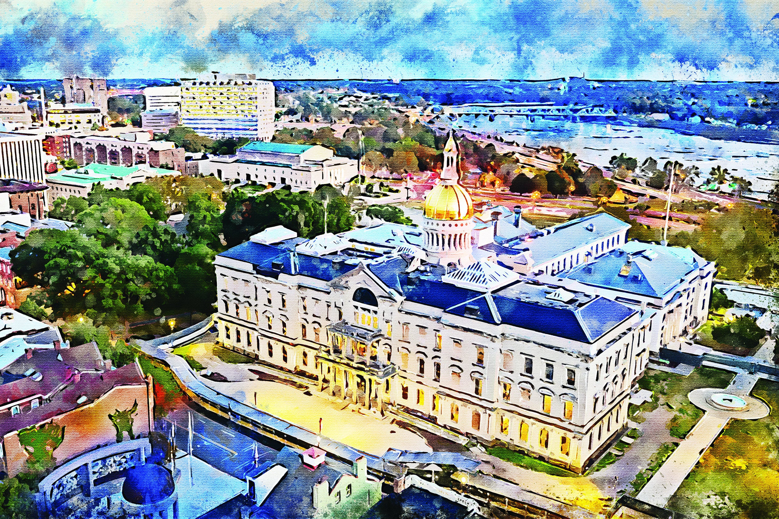 The beautiful watercolor of Trenton NJ on canvas framed and ready to hang. Stunning colors that make for the perfect wall decor. Trenton watercolor canvas skyline