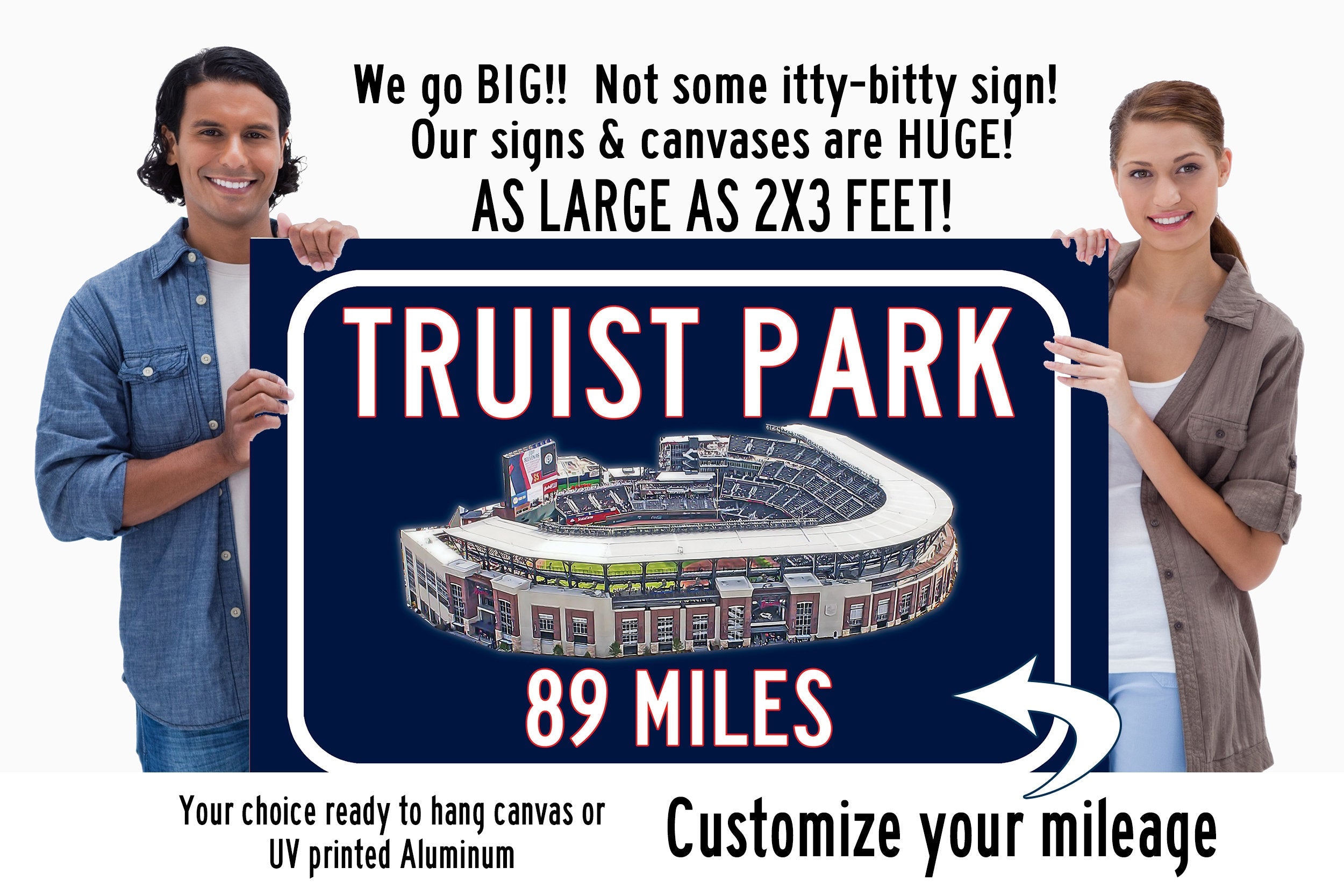 Personalized Highway Distance sign to Truist Park in Georgia. Custom replica road sign, with a watercolor photo of the stadium made with real distance from you to Truist Park. WE GO HUGE!! Not some itty-bitty sign, Our signs are as large as 2 x 3 FEET! Truist Park. Atlanta Braves