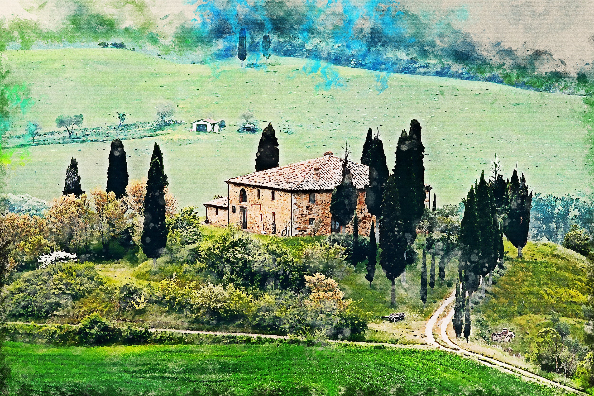 Stunning watercolor of Tuscany in Italy Great for a piece of wall art. Great for a piece of wall art. Available as a single canvas at 16″ x 24″ , 24″ x 36″ , or 32″ x 48″ or we can make you a special 3 panel work of art as large as 4 x 8 foot wide. Tuscany watercolor canvas