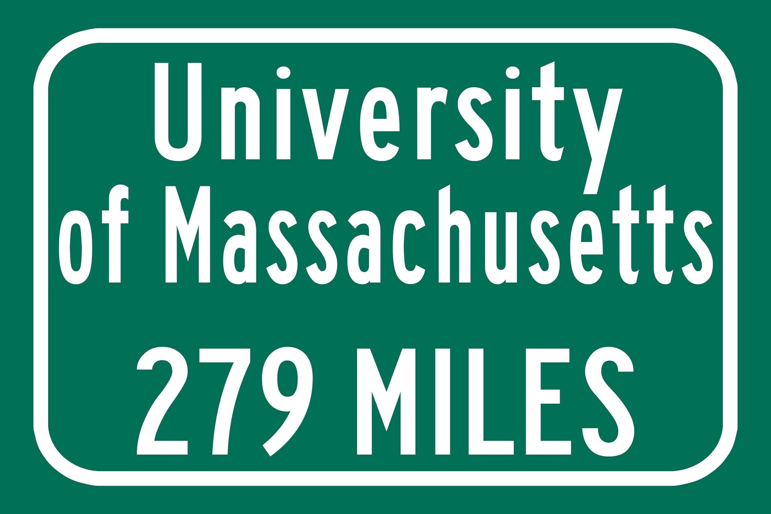 Personalized Highway Distance sign to UMass , UMass sign. UMass sign.
