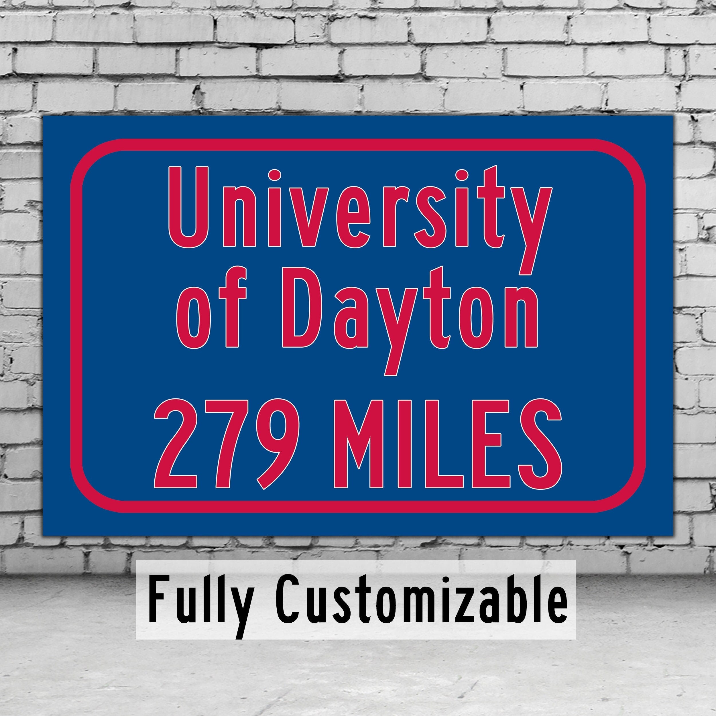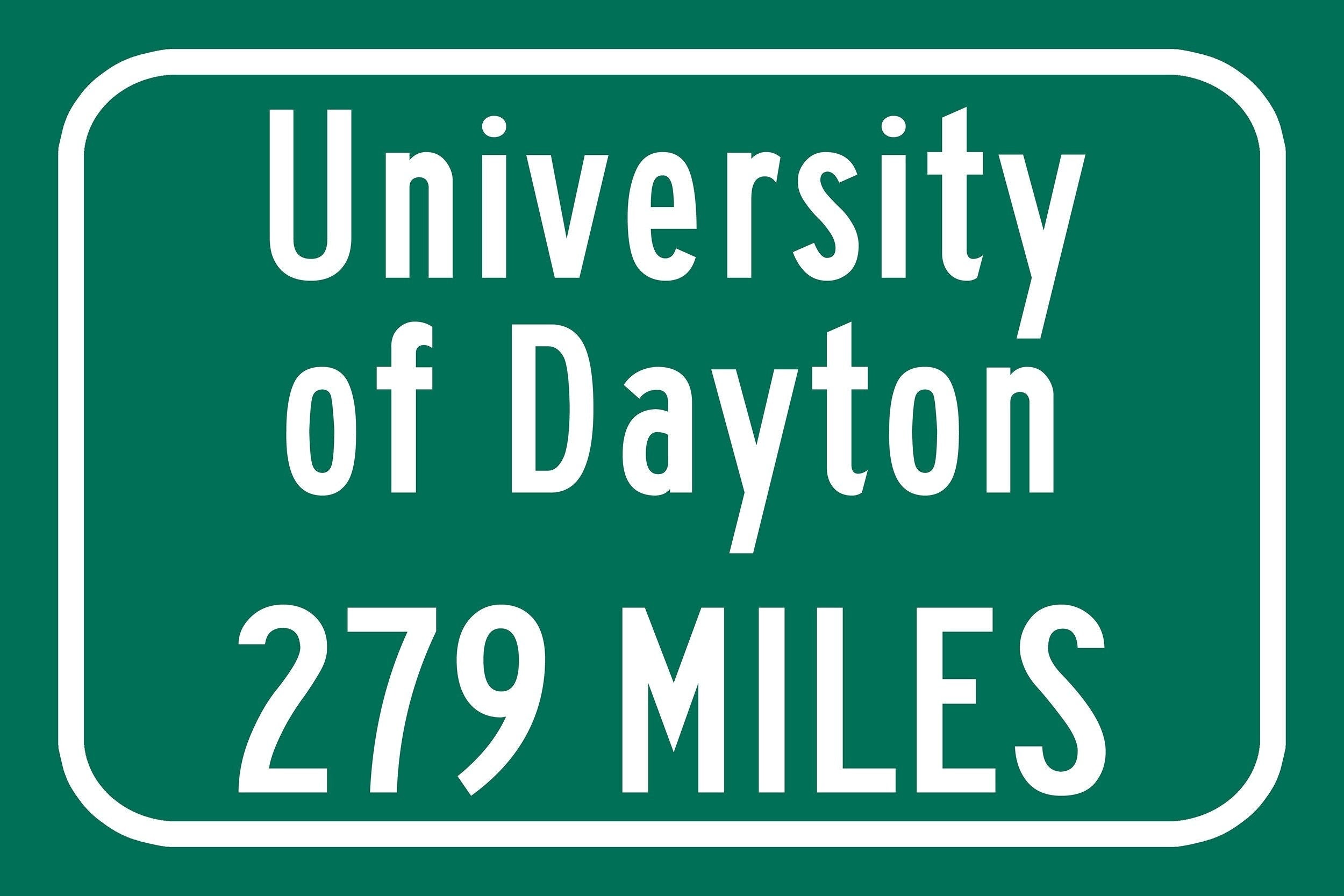 Personalized Highway Distance sign to University of Dayton , University of Dayton sign. University of Dayton Flyers sign.