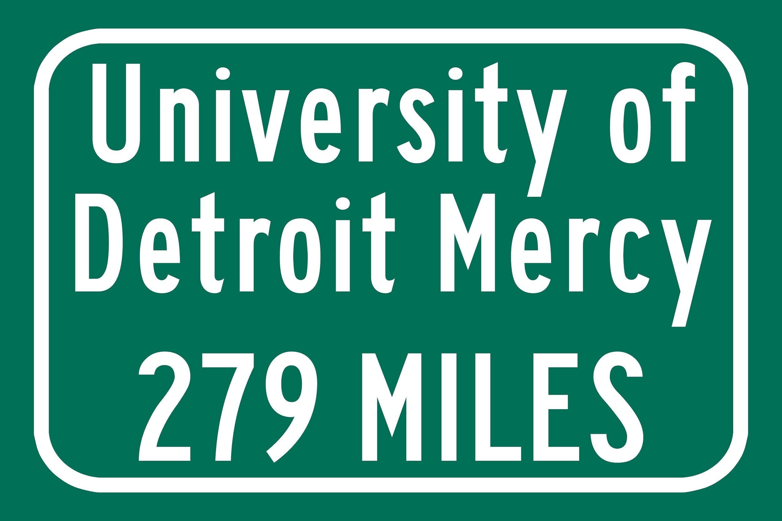 Personalized Highway Distance sign to University of Detroit Mercy / Detroit Mercy Titans / Detroit Michigan /
