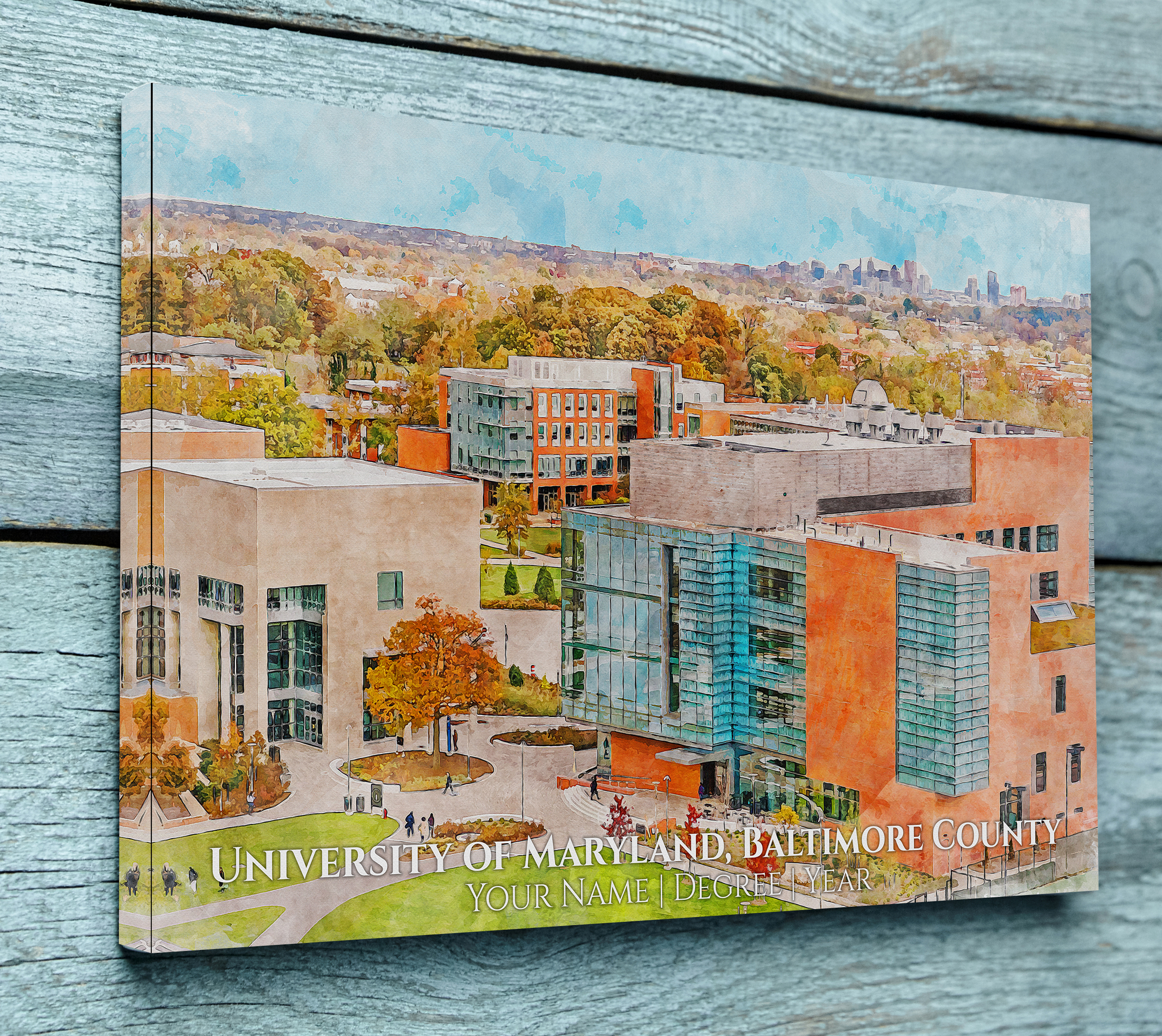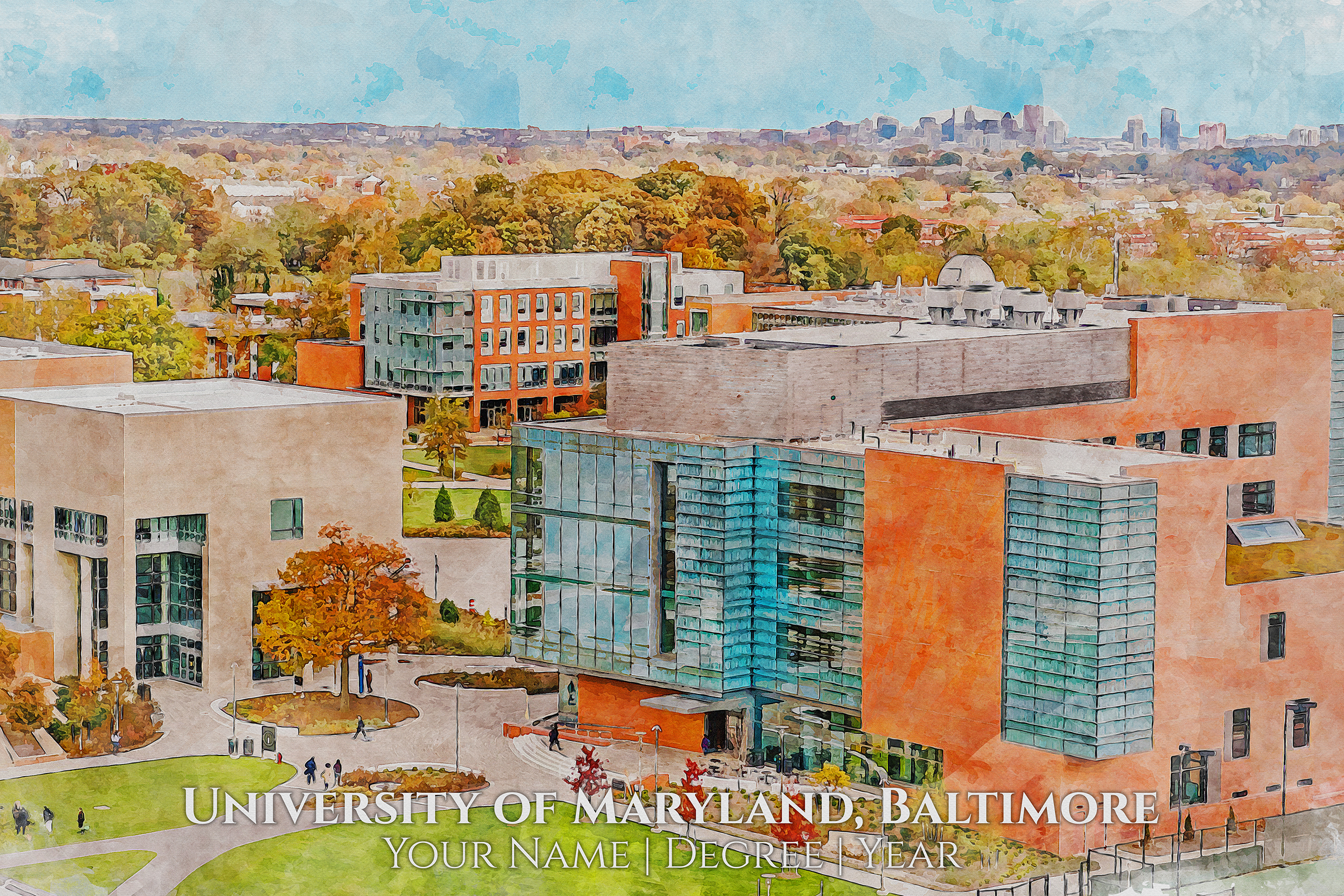 You will love these watercolor digital prints of University of Maryland, Baltimore. Perfect for a graduation gift. These make wonderful gift for University of Maryland Baltimore Alumni, parents and fans. Feel free to customize it as well when you check out. We will send a proof for you to approve before we print so please check your email about 24hrs after you order