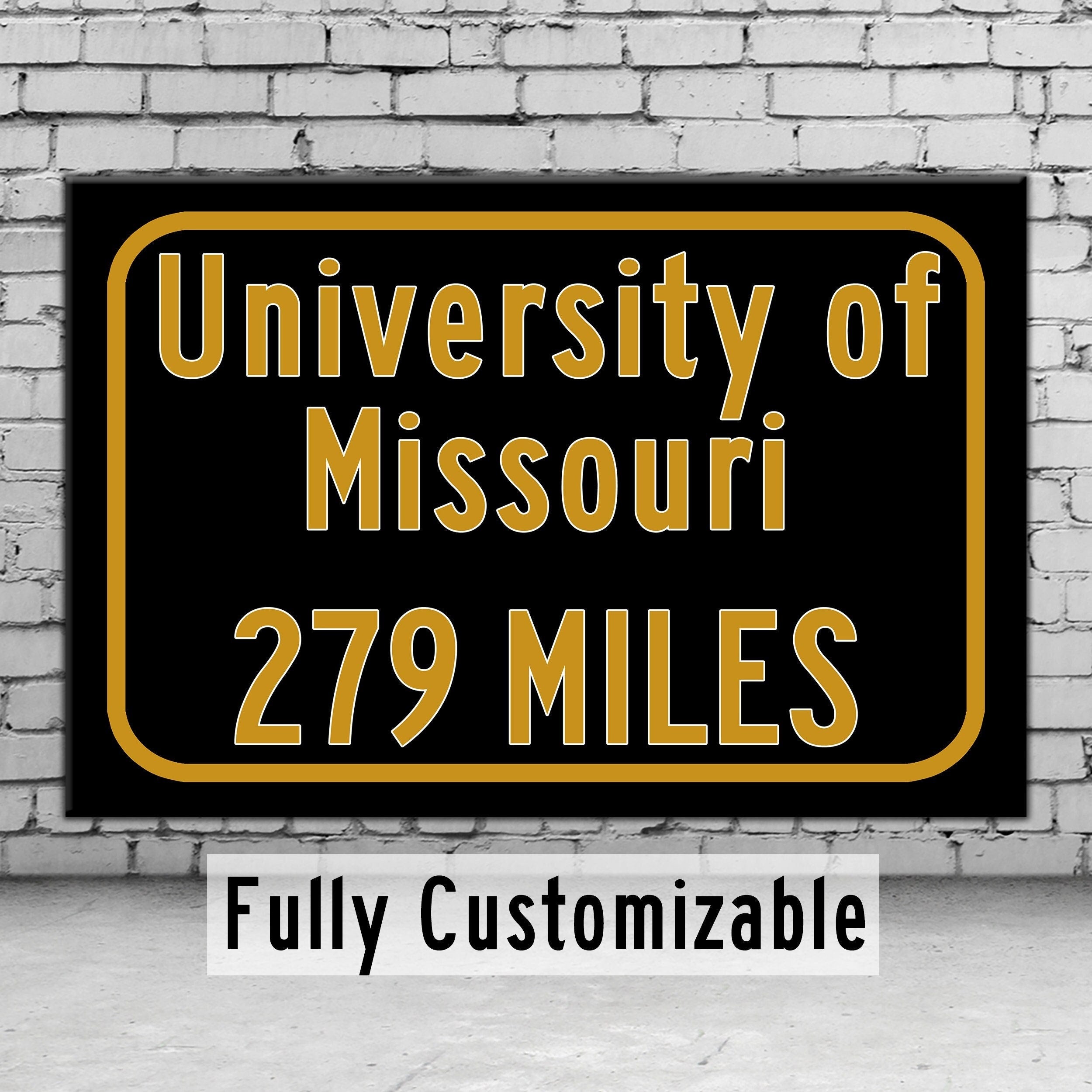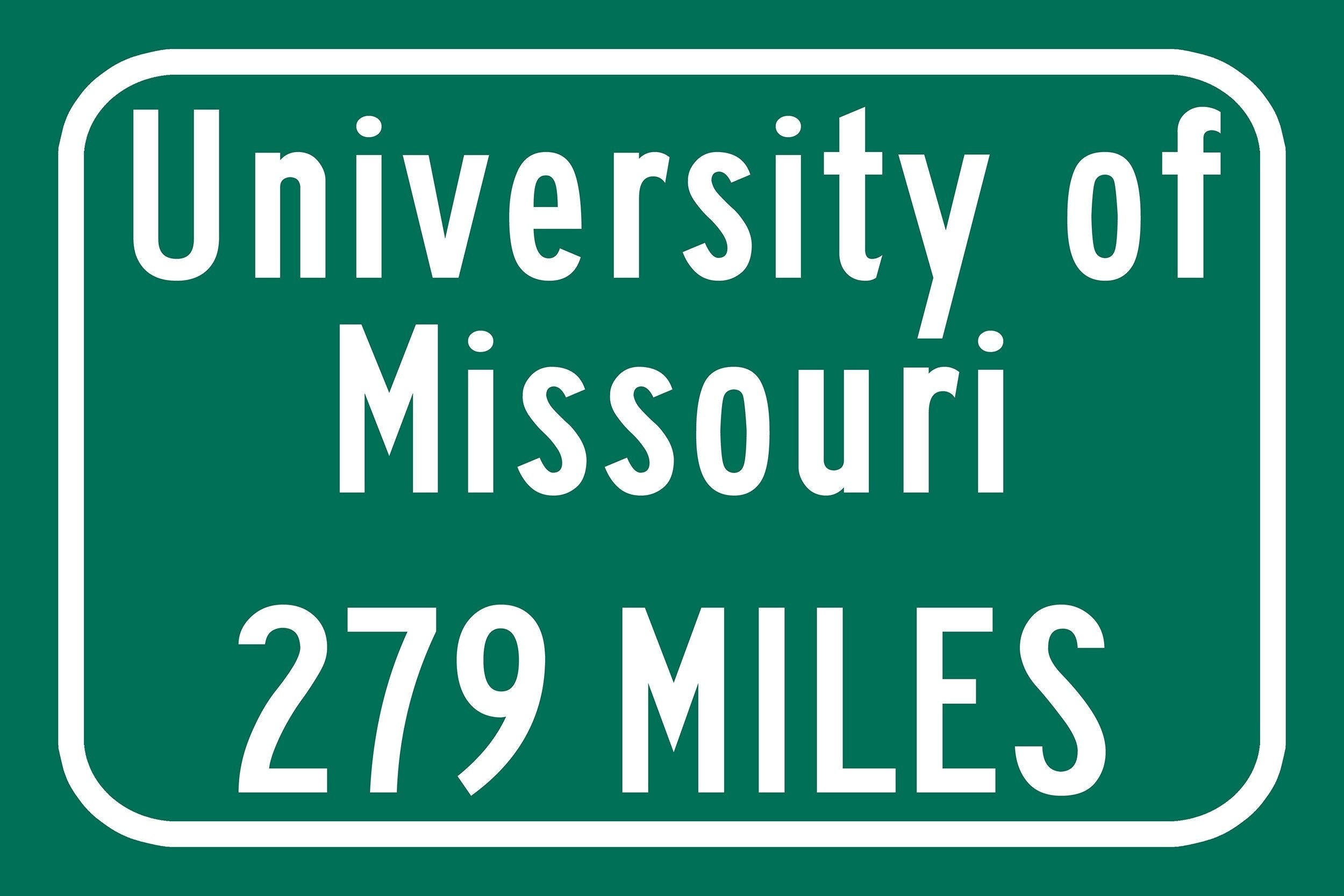 Personalized Highway Distance sign to University of Missouri. Columbia Missouri