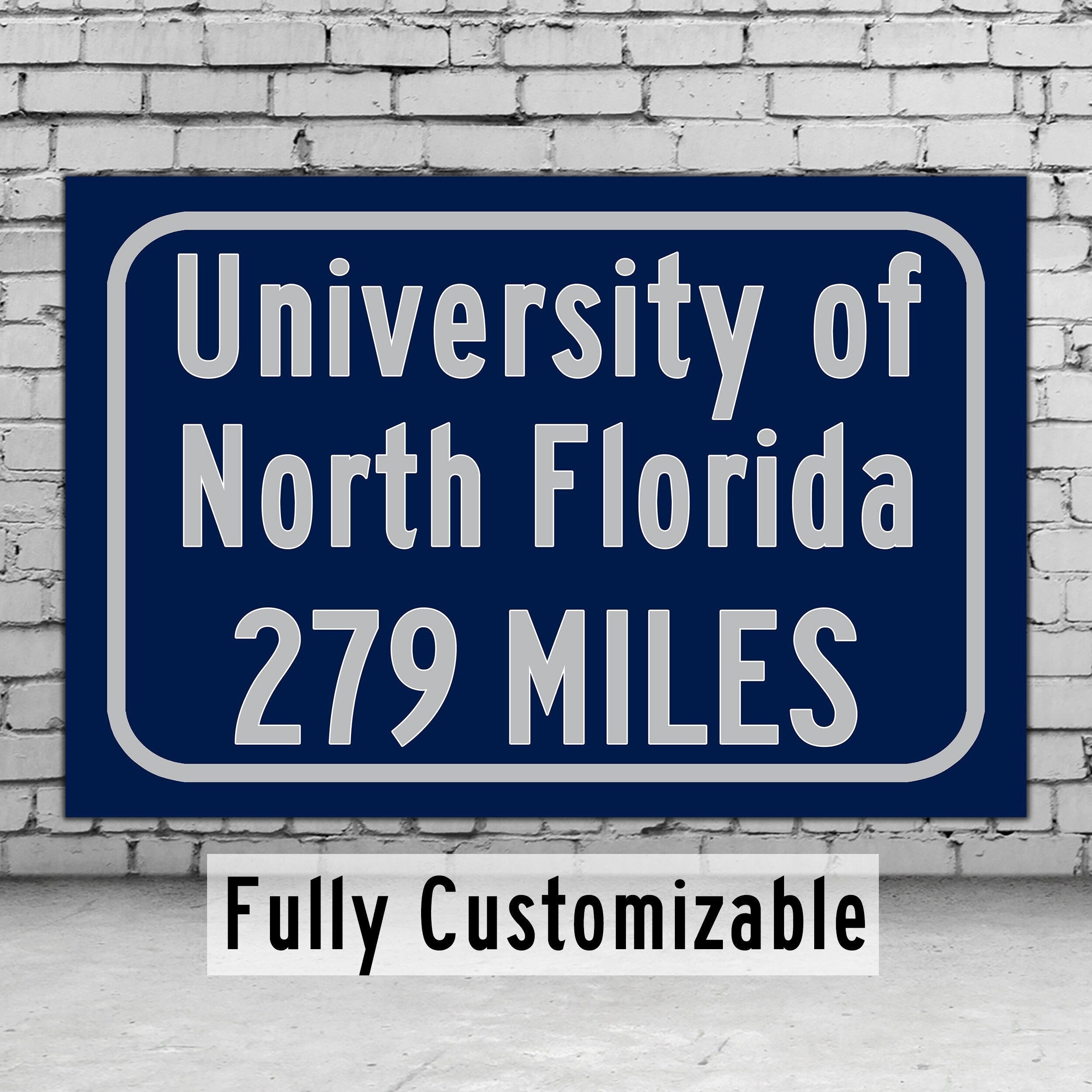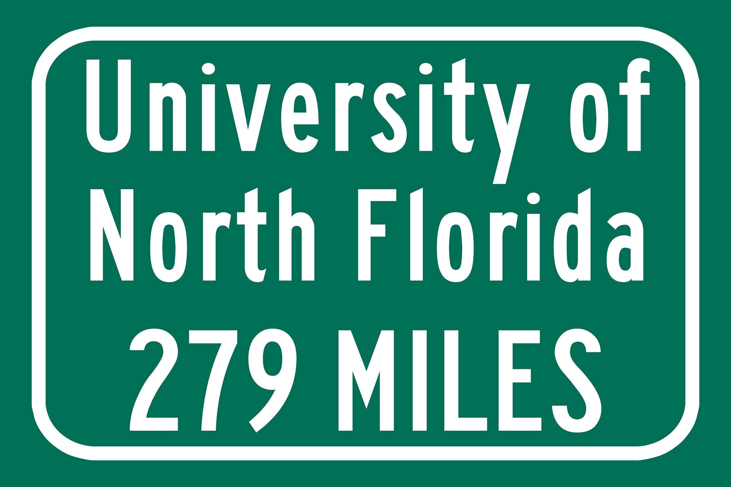 Personalized Highway Distance sign to University of North Florida, University of North Florida sign. University of North Florida Ospreys sign.