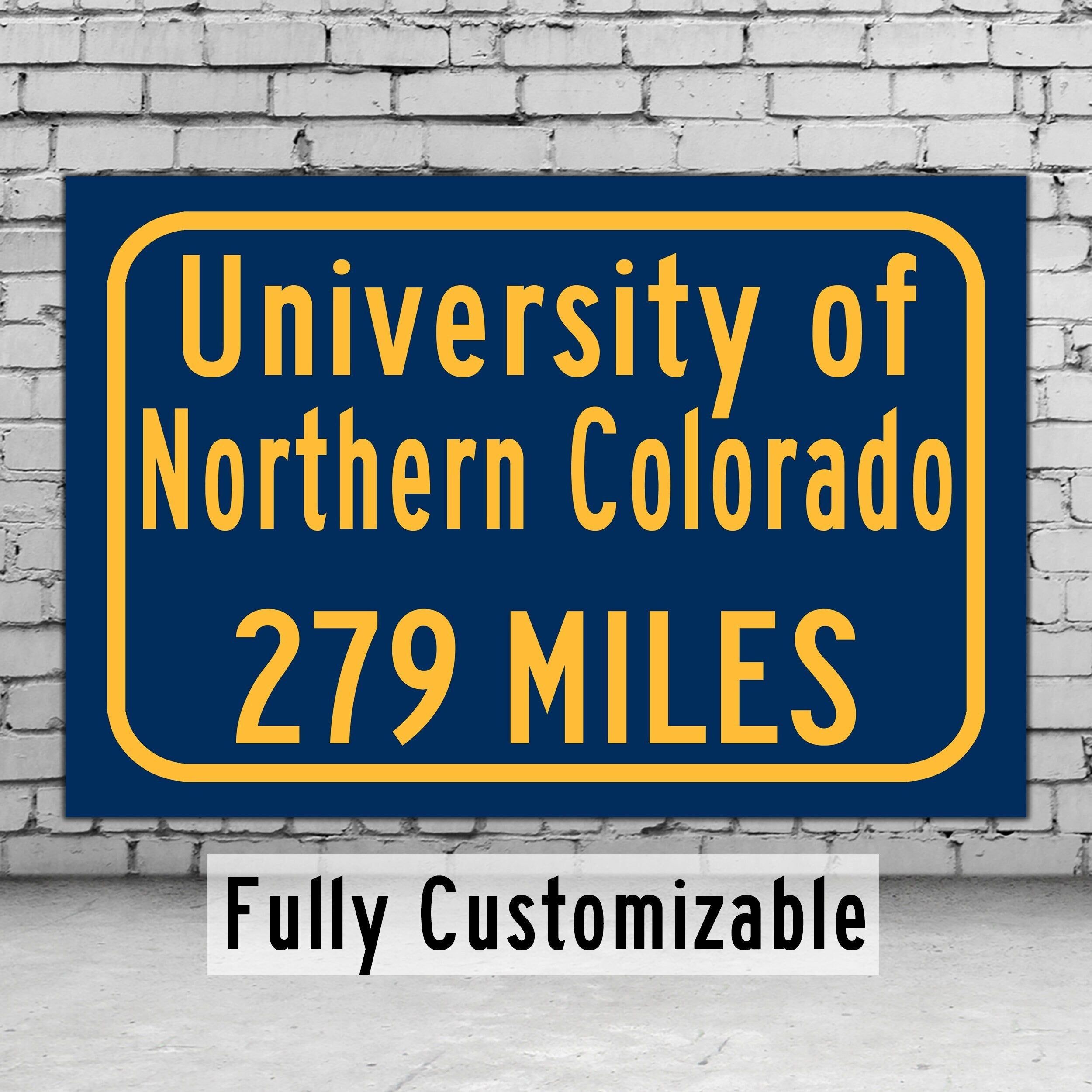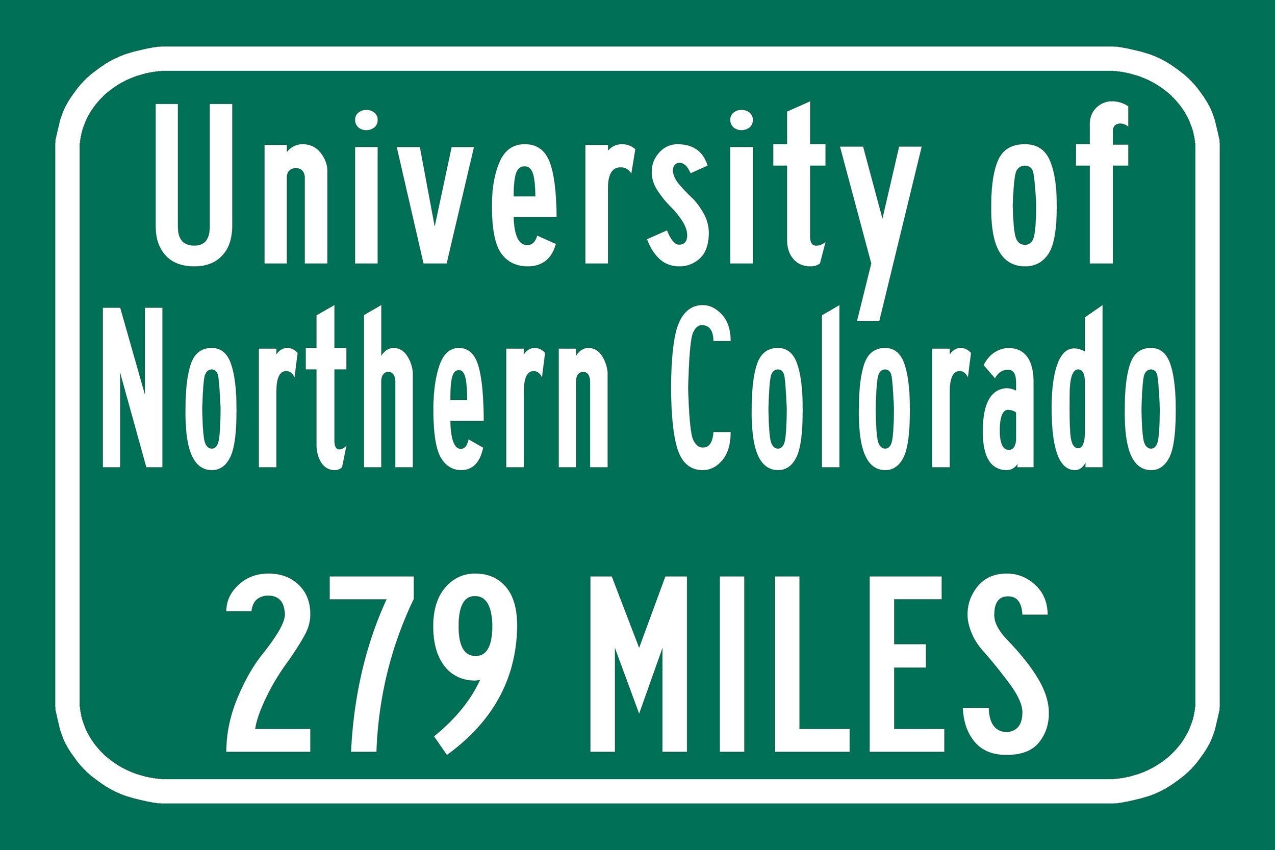 Personalized Highway Distance sign to University of Northern Colorado, University of Northern Colorado sign. University of Northern Colorado Bears sign.