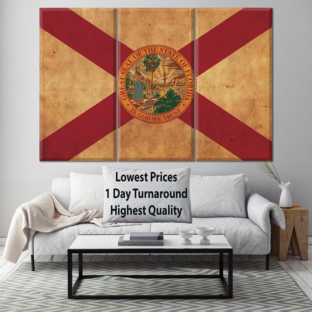 Vintage created Florida Flag. Show your Sunshine state Pride. Great for a piece of wall art. Available as a SINGLE canvas at 16″ x 24″ , 24″ x 36″ , or 32″ x 48″ or a 3 panel work of art canvas as 5 x 3 foot wide.