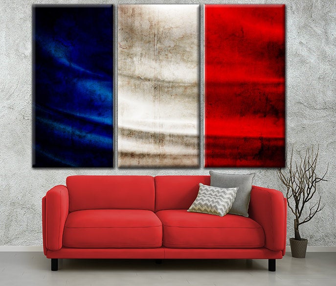 Vintage created France Flag. Show your French Pride. Great for a piece of wall art. Available as a SINGLE canvas at 16″ x 24″ , 24″ x 36″ , or 32″ x 48″ or a 3 panel work of art canvas as 5 x 3 foot wide.