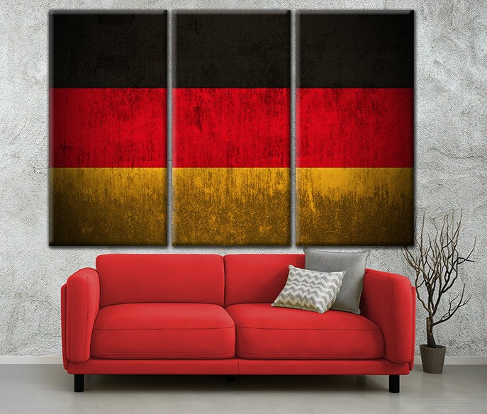 Vintage created German Flag. Show your German Pride. Great for a piece of wall art. Available as a SINGLE canvas at 16″ x 24″ , 24″ x 36″ , or 32″ x 48″ or a 3 panel work of art canvas as 5 x 3 foot wide.
