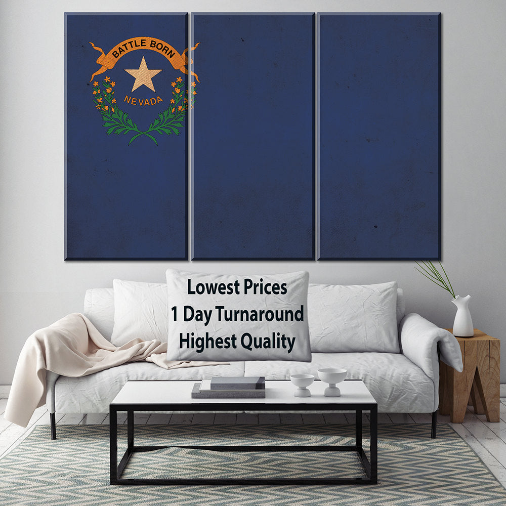 Vintage created Nevada Flag. Show your Nevada Pride. Great for a piece of wall art. Great for a piece of wall art. Great for a piece of wall art. Available as a SINGLE canvas at 16″ x 24″ , 24″ x 36″ , or 32″ x 48″ or a 3 panel work of art canvas as 5 x 3 foot wide.