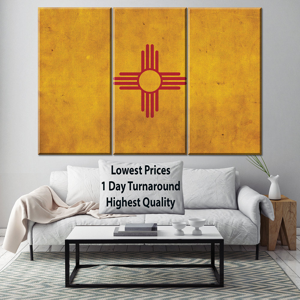 Vintage created New Mexico Flag. Show your New Mexico Pride. Great for a piece of wall art. Great for a piece of wall art. Great for a piece of wall art. Available as a SINGLE canvas at 16″ x 24″ , 24″ x 36″ , or 32″ x 48″ or a 3 panel work of art canvas as 5 x 3 foot wide.