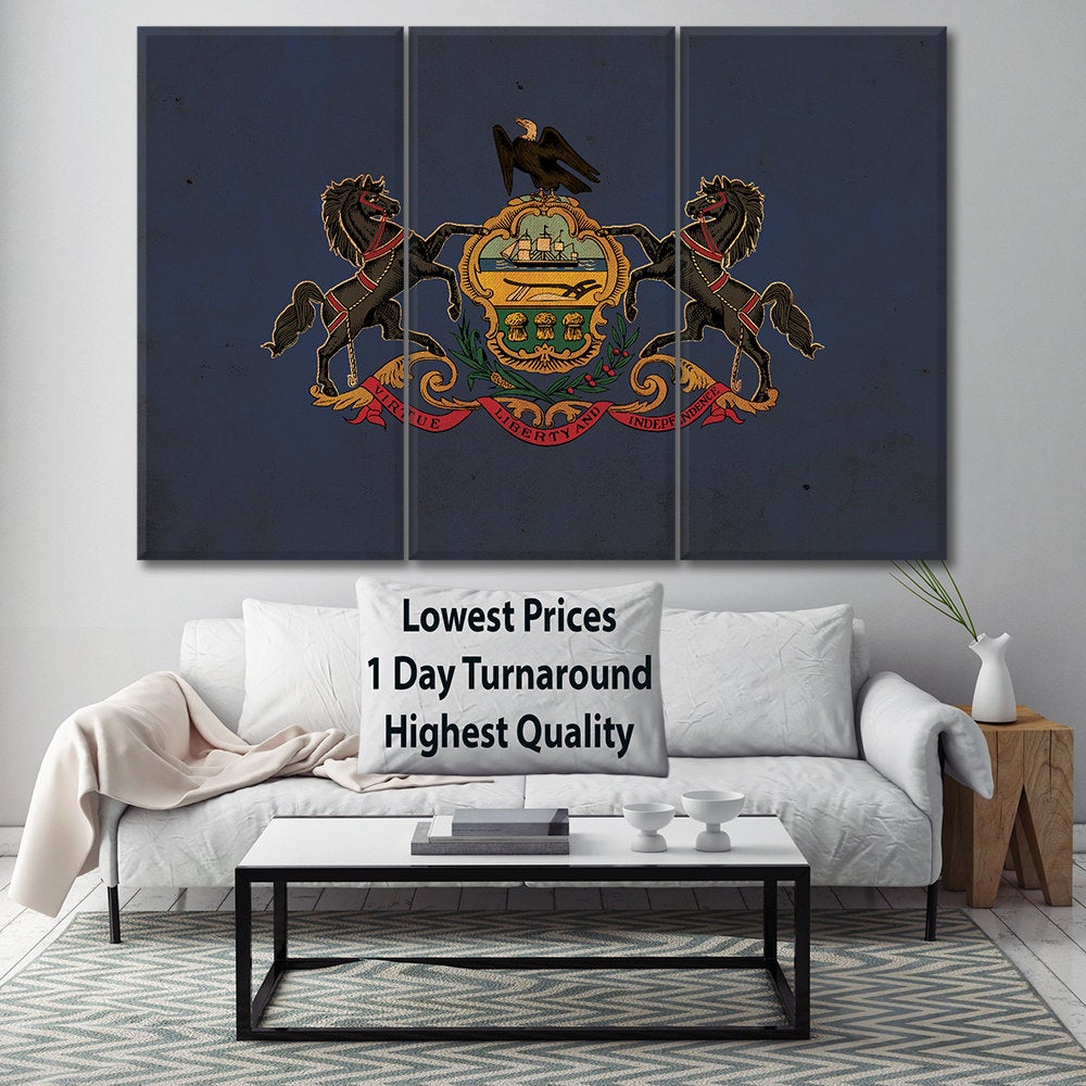 Vintage created Pennsylvania Flag. Show your Pennsylvania Pride. Great for a piece of wall art. Great for a piece of wall art. Available as a SINGLE canvas at 16″ x 24″ , 24″ x 36″ , or 32″ x 48″ or a 3 panel work of art canvas as 5 x 3 foot wide.