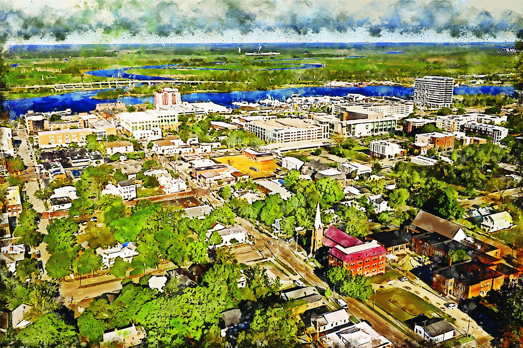 The beautiful watercolor of Wilmington North Carolina on canvas framed and ready to hang. Stunning colors that make for the perfect wall decor. Wilmington watercolor